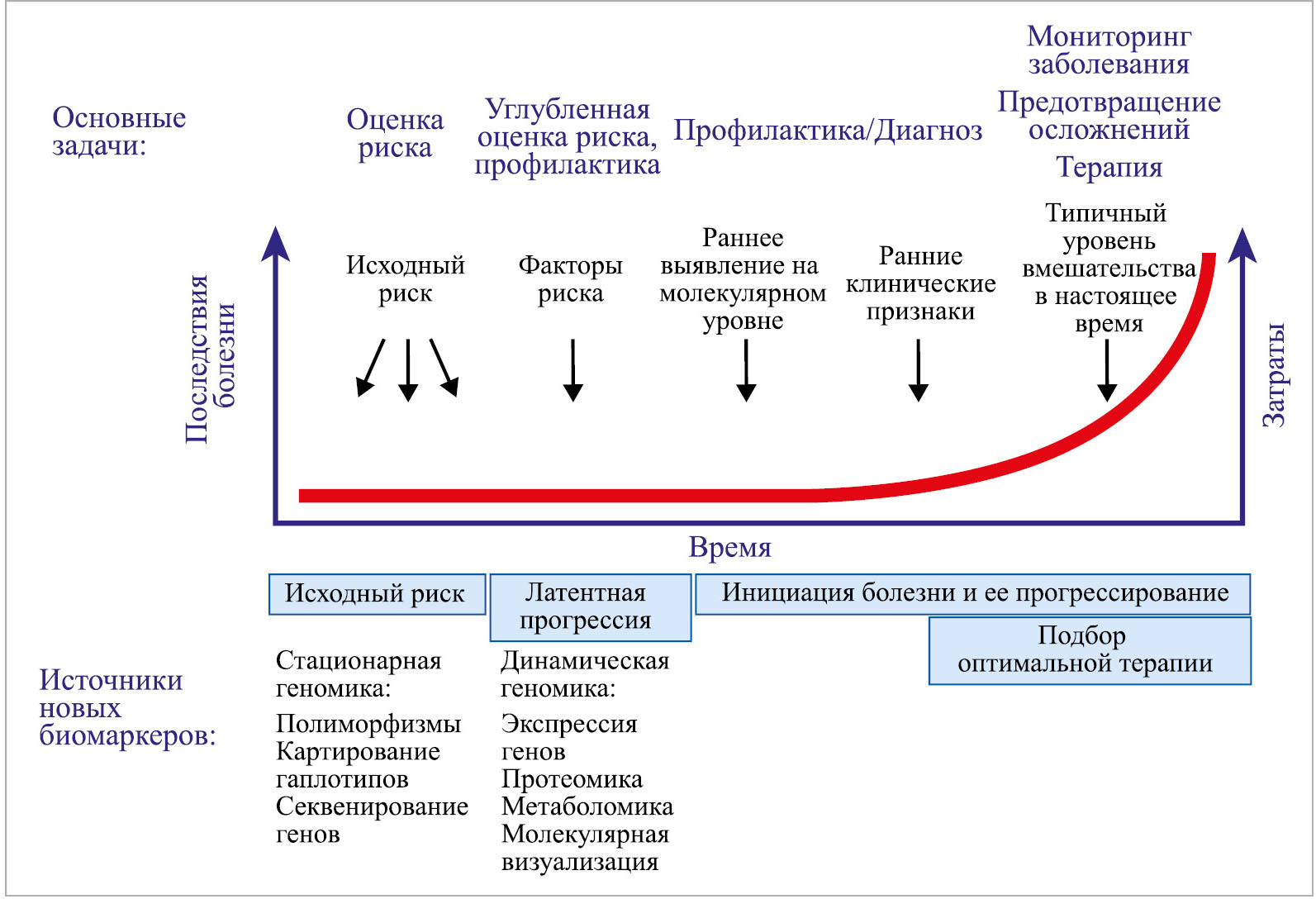 На основании комплексной оценки состояния молекулярно-генетического гомеостаза диагностируется наличие или отсутствие фактов индукции патологических процессов, а также оценивается прогноз тяжести их течения. Соответственно, разрабатываемые в рамках концепции ППМ протоколы превентивно-профилактических мероприятий предполагают воздействие на патологические процессы в скрытом (латентном, доклиническим и, как правило, бессимптомном) периоде болезни – до появления признаков клинической манифестации. При этом превенция как один из ключевых инструментов ППМ направлена на существенное снижение риска индукции патологии и/или блокирование основных механизмов, которые, будучи детерминированными генами предрасположенности, стимулируют ее развитие. Именно в структуре превентивно-профилактического сегмента ППМ заложены не только философия и альтернативная идеология, но и новая методология здравоохранения, суть которой заключается в управлении состоянием здоровья с помощью предикции и превенции – основных технологий здоровьесбережения (Vogenberg et al., 2010a, 2010b).