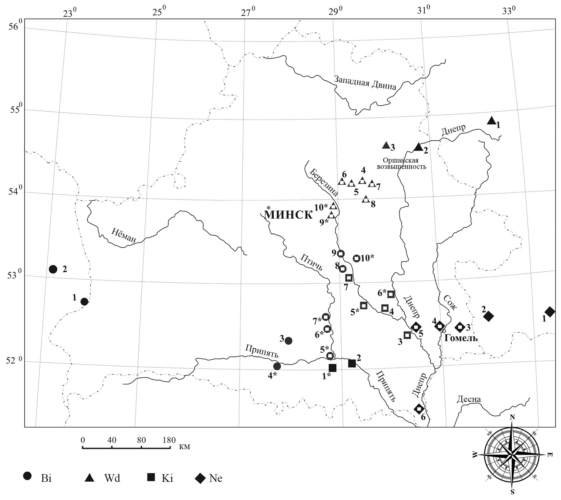 Рис. 1. Пункты отлова обыкновенной бурозубки Sorex araneus с метацентриками хромосомных рас: Bi – Białowieża (кружки), Wd – Западная Двина (треугольники), Ki – Киев (квадраты), Ne – Нерусса (ромбы). Белый квадрат в значке хромосомной расы обозначает отсутствие в кариотипе популяции одного и более диагностических метацентриков расы. Звездочкой * отмечены выборки с акроцентрическим кариотипом. Пунктиром обозначены границы государств. Номера пунктов сбора соответствуют табл. 1.