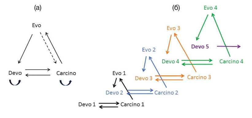 Отсутствие стрелок devo -> evo на carcino-evo-devo диаграммах (a) и (б) является важным запретом: для эволюции развития необходима переходная форма Carcino. Нормальный онтогенез не может эволюционировать из-за ограничений, связанных с развитием (developmental constraints) (Kozlov, 2019).
