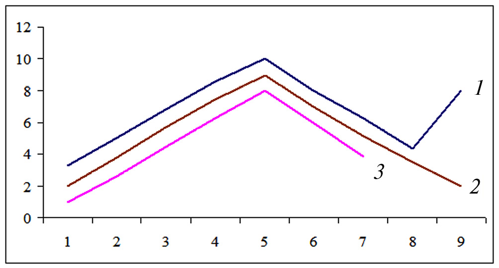 Рис. 1. Характер воя взрослых самца (3), самки (2) и полувзрослого (1) волка (по оси абсцисс — продолжительность воя, в условных единицах; по оси ординат — громкость воя, в условных единицах).