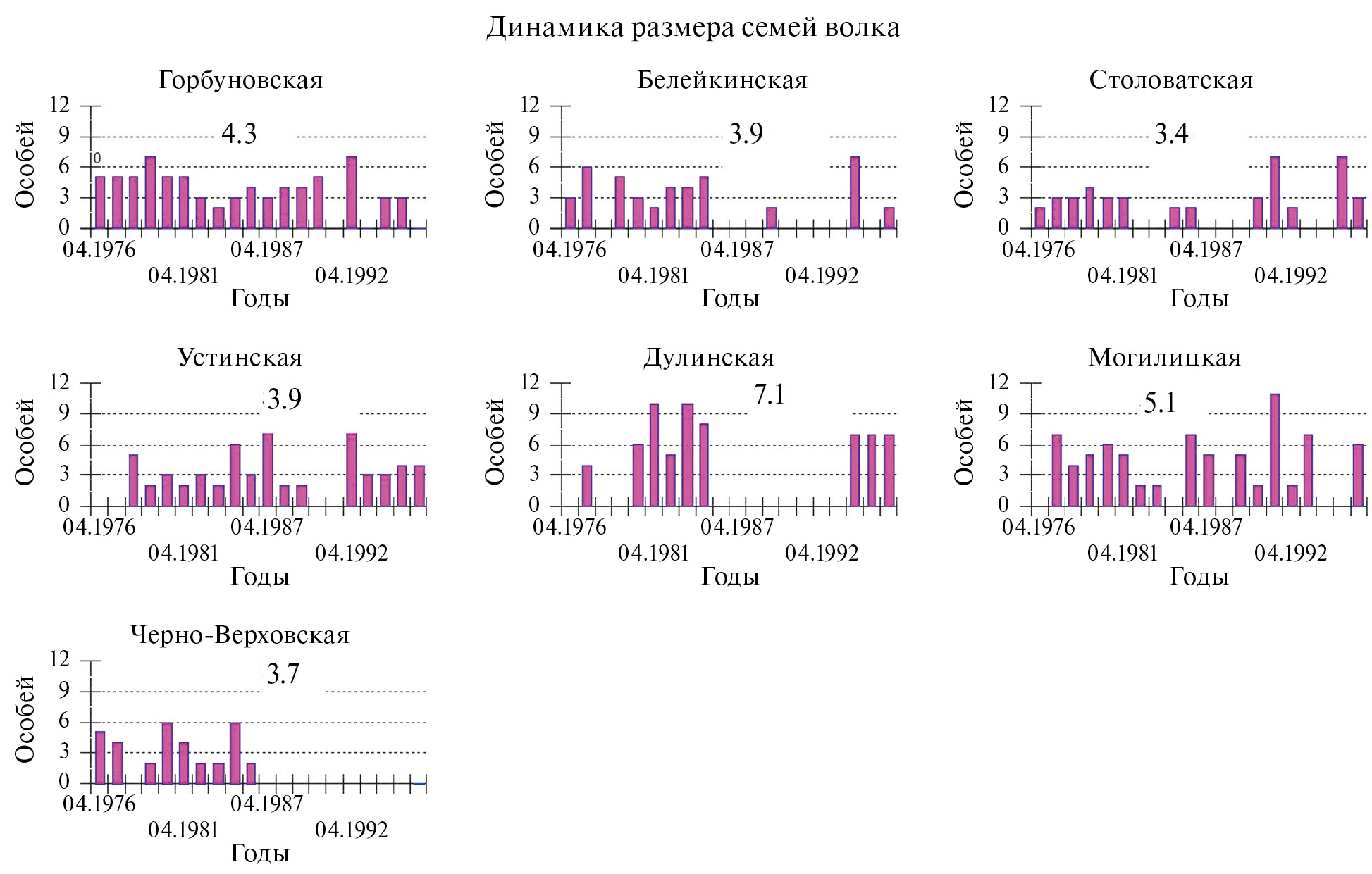 Наличие выводка в той или иной семье устанавливали вначале методом идентификации размера отпечатка передней правой стопы волка по гипсовым слепкам родительских пар. Затем методом подвывки, опроса охотников, местного населения подтверждались данные о выводке. В снежный период методом тропления определяли количественный состав семьи: выделяли родительскую пару и молодых (в ноябре–январе); по количеству постоянных лежек или следам, когда волки идут цепью (на дороге, по насту после снегопада, при подготовке к атаке лося) — число особей в семье. Молодых самцов определяли по характеру мочевой метки. Итоговый результат, отражающий ежегодную динамику количественного размера семей популяционной группировки волка представлен в табл. 1. В анализ включены 147 семей волка, а также учтены сведения по количественному составу 135 стай (семей) волка из Калининской (Тверской) обл., согласно данным районных охотоведов в январе 1980 г.