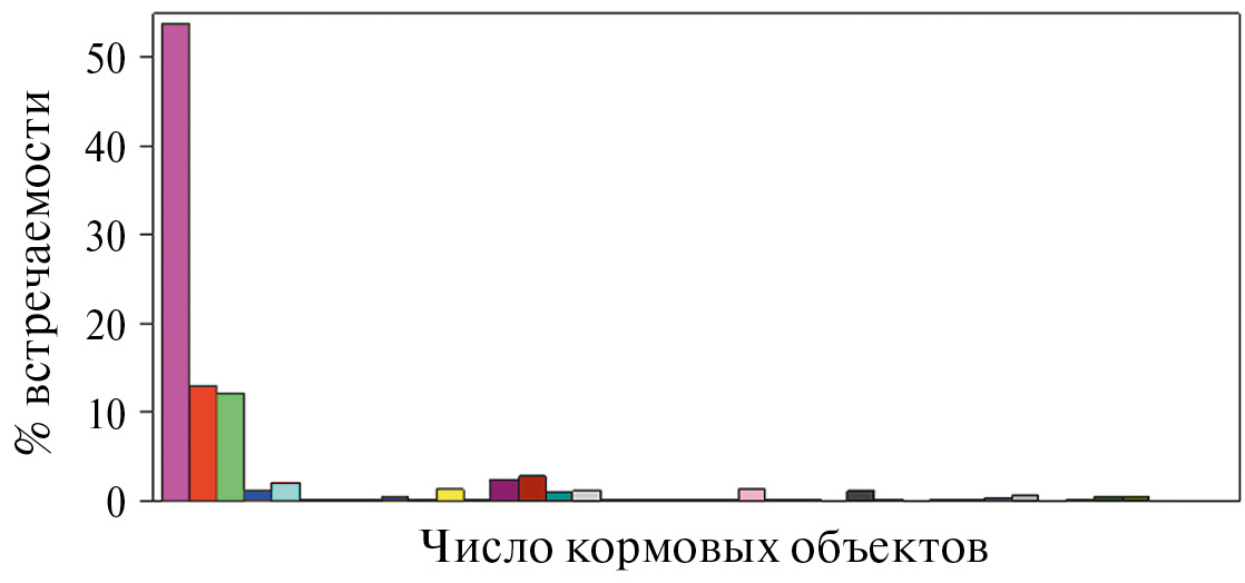 При определении ширины реализованной трофической ниши популяционной группировки и семей волка в ЦЛБЗ включены данные копрологического анализа (n = 1228) шести семей: Белейкинской, Горбуновской, Могилицкой, Столоватской, Устинской и Черно-Верховской. В процессе охот на волка вне заповедного ядра из этих семей в разные годы элиминировались взрослый самец или самка, но территориальная структура этих семей сохранялась. Следовательно, питание отражает особенности охотничьего поведения родительских пар, местообитаний и видового состава потенциальных жертв.