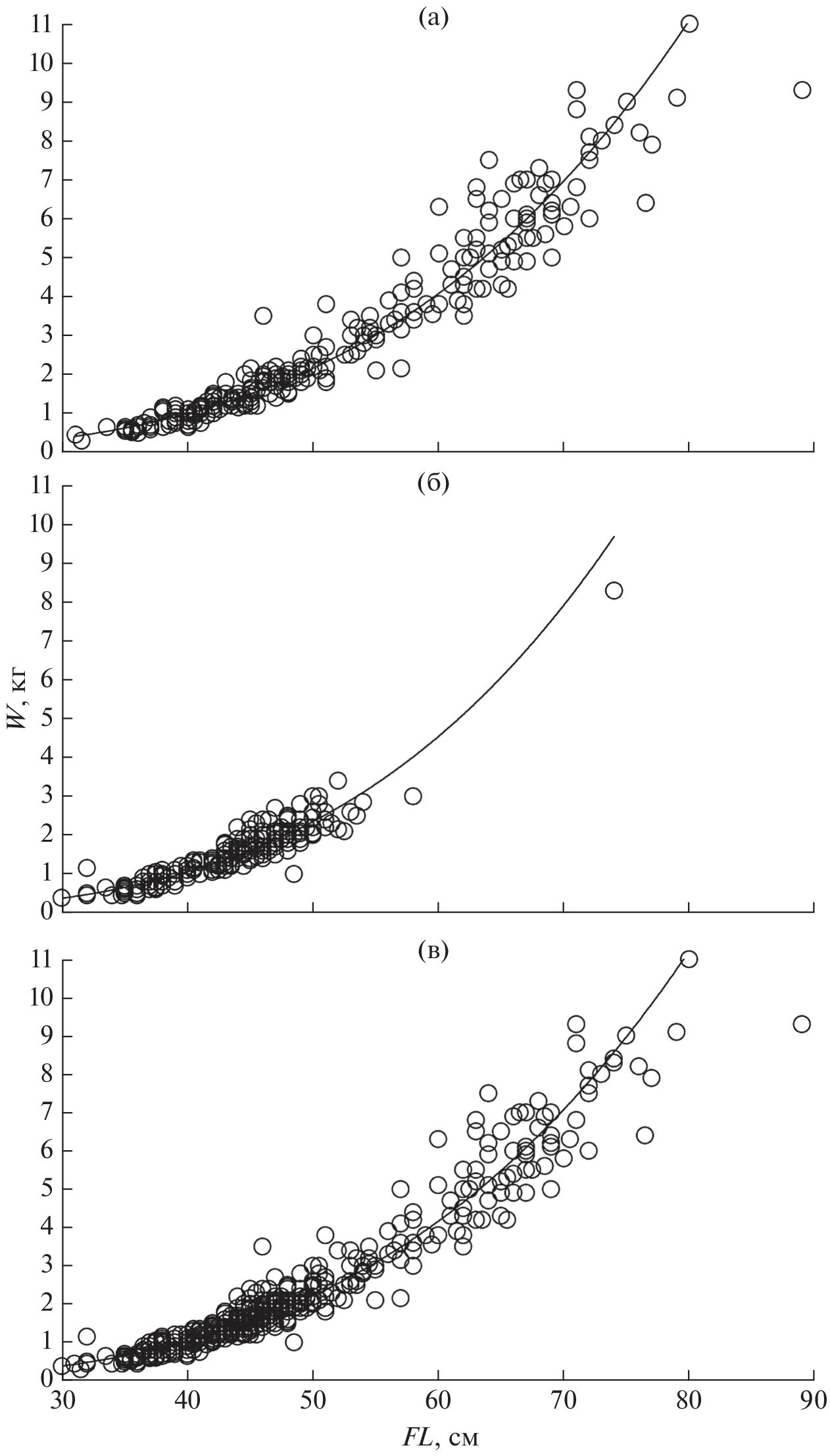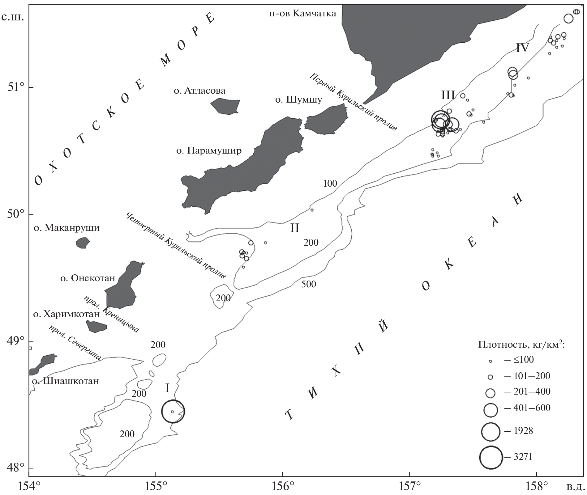 The spatial distribution, size-sex composition, feeding of Myoxocephalus polyacanthocephalus and accompanying species in the Pacific waters off the northern Kuril Islands and southeastern Kamchatka in the autumn period are considered. In August–November 1997, this species was represented in catches by individuals with a length of 30-89 (on average 47.8 ± 0.5) cm and a body weight of 300–11000 (2321 ± 90) g. Females dominated over males; the sex ratio was 1.2 : 1.0. The relationship between the body weight and length of great sculpin is described by the exponential equation: W = 0.0031FL3.446 (R2 = 0.935). The food spectrum of great sculpin includes fish (56.2% of the diet), mainly the walleye pollock Gadus chalcogrammus and Atka mackerel Pleurogrammus monopterygius (19.9 and 11.9%, respectively); fish processing wastes (19.6%), mainly heads of Atka mackerel (12.2%); as well as decapods (18.6%), mainly the snow crab Chionoecetes opilio (14.1%). As great sculpin grow, decapods are replaced by fish in the diet and walleye pollock is replaced by Atka mackerel and Liparidae. The size and sex composition and feeding patterns of great sculpin as well as the species composition of the accompanying species differed in some parts of the surveyed area. The co-occurrence of great sculpin with walleye pollock and the northern rock sole Lepidopsetta polyxystra was 100%.