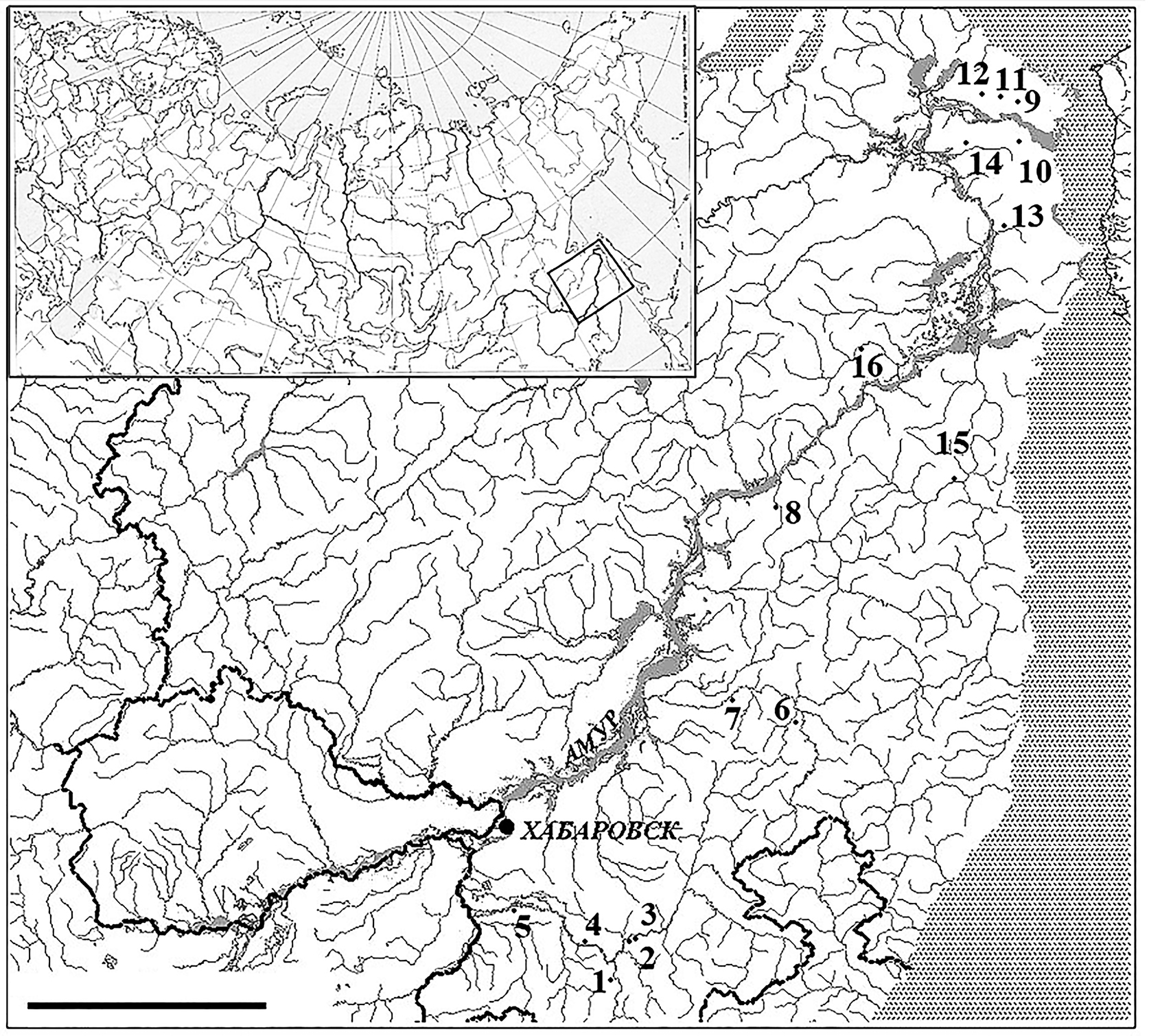 Материал собран в 16 локациях бассейна нижнего Амура и р. Уссури в 2004–2008 гг. (рис. 1). Места сбора, число и размерный состав рыб проанализированных выборок нижнеамурского хариуса представлены в табл. 1. Учитывая размерно-возрастную морфологическую изменчивость и половой диморфизм вида (Михеев, 2009а, 2009б), для сравнительного морфологического анализа использовали неполовозрелых рыб одного размерного класса.