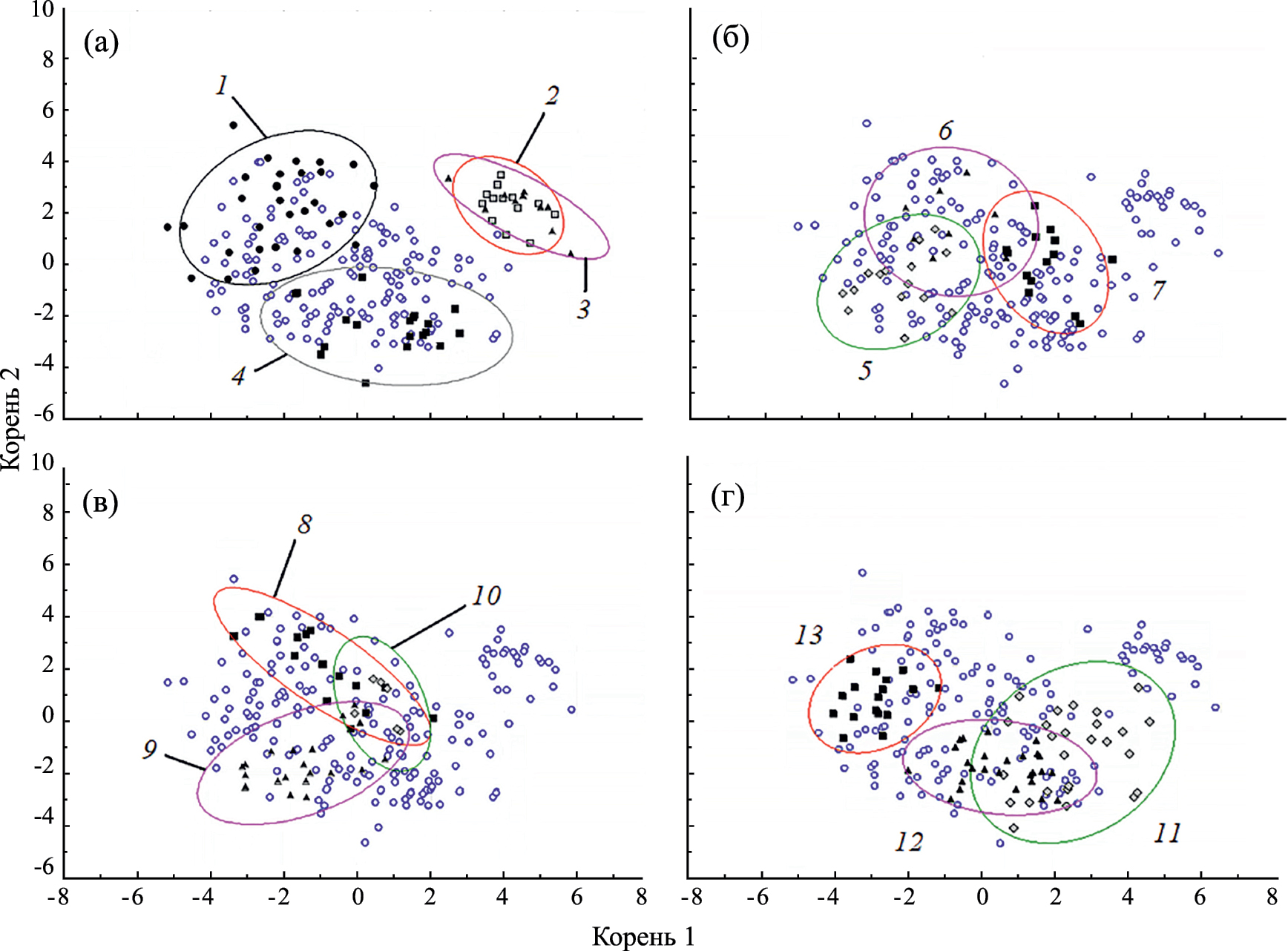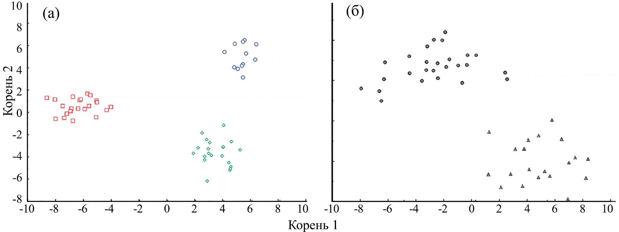 Рис. 4. Диаграмма рассеяния хариусов Thymallus tugarinae рек Хор (а) и Анюй (б) в пространстве первых двух канонических корней по 47 морфологическим признакам. Расстояние от устья, км: (○) – 30, (◊) – 103, (□) – 165; течение: (●) – нижнее, (▲) – среднее.