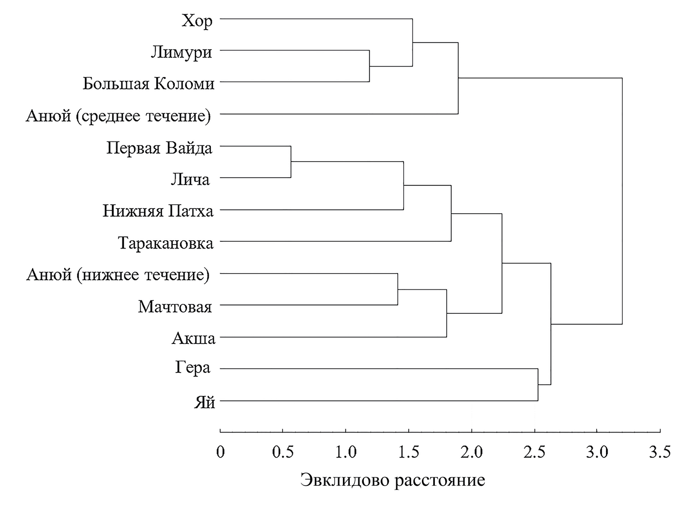 Хариусы среднего течения р. Анюй, рыбы р. Лимури, Хор и Большая Коломи вошли в отдельный кластер, который обособляется при наибольшем значении расстояния Эвклида – 3.2. Рыб этих водотоков объединяют относительно высокие значения индексов длины голо- вы (Хор, Большая Коломи), её высоты у затылка и через глаз (Большая Коломи, Анюй), длины её средней части и длины верхней челюсти (Хор, Большая Коломи, Лимури), антевентрального (Хор, Большая Коломи) и антеанального (Хор, Большая Коломи) расстояний, а также низкие значения индексов длины средних лучей хвостового плавника (Анюй, Лимури). Кроме того, эти выборки были объединены наименьшим средним числом чешуй в боковой линии и высоким числом лучей в брюшном и анальном плавниках (Большая Коломи, Лимури, Хор), что может указывать на гетерохронии в их формировании, по сравнению с рыбами других рек (Лёвин, 2011). Хариусы этого кластера были собраны в реках, различающихся по своей протяжённости и гидрологическим характеристикам в местах отлова рыб. Объединение особей с признаками, характерными для рыб, обитающих как в условиях повышенных (высокая голова и увеличенные aV, aA), так и пониженных (удлинённая голова и её средняя часть) скоростей течения, говорит о том, что в этом случае для интерпретации результатов необходимо использование дополни- тельных данных об условиях обитания рыб, которыми мы не располагаем.