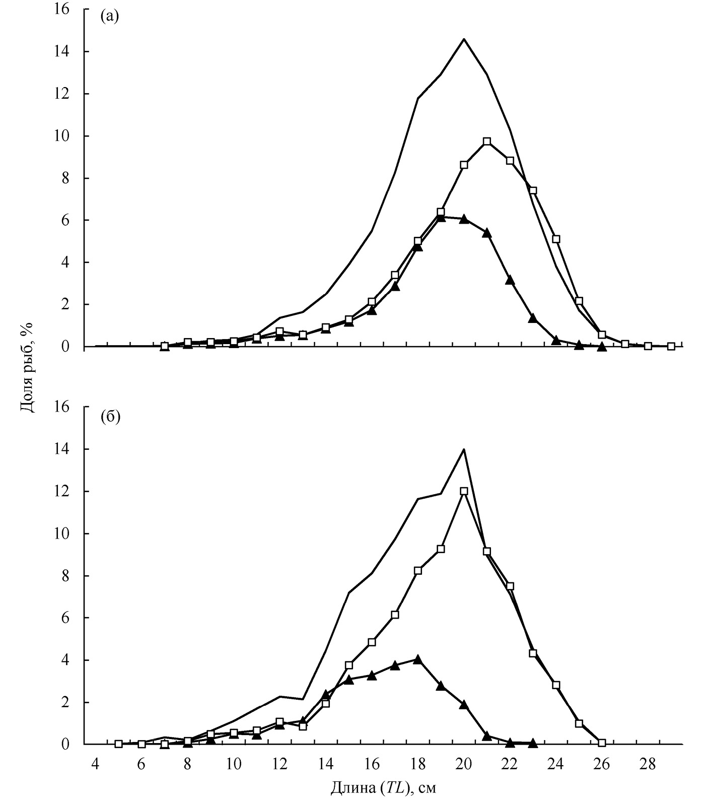 Рис. 2. Размерный состав (абсолютная длина) нитчатого шлемоносца Gymnocanthus pistilliger в уловах в летний период в зал. Петра Великого (а) и у Западной Камчатки (б): (―□―) – самки, (―▲―) – самцы, (―) – оба пола.