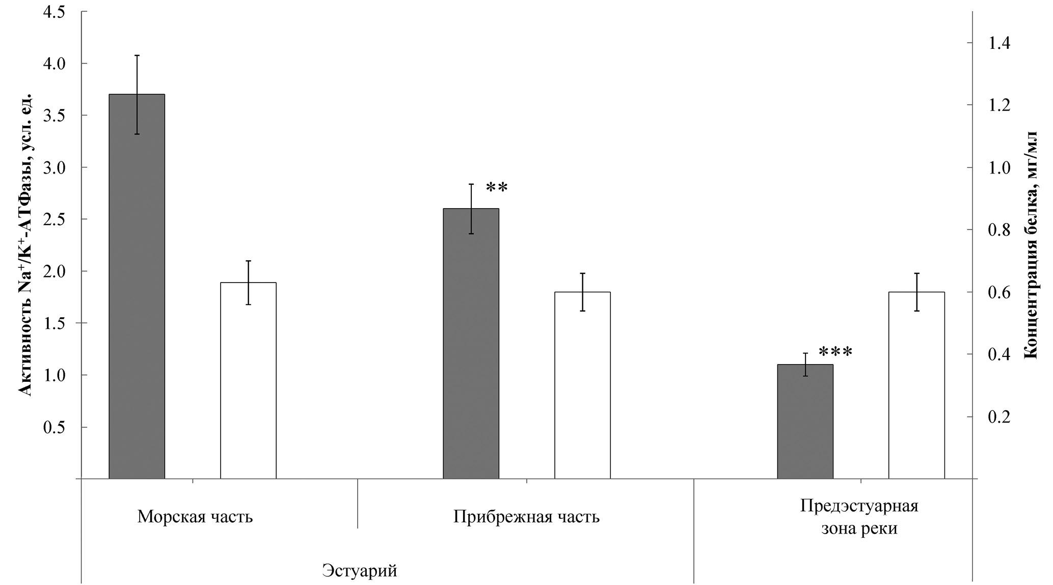 Средние значения активности Na+/K+-АТФазы (■) и концентрации белка (□) в жабрах горбуши Oncorhynchus gorbuscha из разных участков р. Индёра в ходе нерестовой миграции 10–15.08.2021 г.: (I) – стандартная ошибка среднего. Отличия от соответствующего показателя у рыб из морской части эстуария по U-критерию Манна–Уитни достоверны при p: ** < 0.01, *** < 0.001.