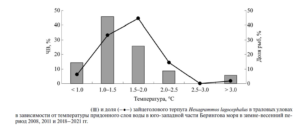 По сведениям Золотова (1985), зайцеголовый терпуг может обитать в очень широком интервале температур придонных вод: от −1.4 до 13.0°С. При этом у тихоокеанского побережья Камчатки и Северных Курил с января по апрель термические условия обитания не всегда постоянны. В этом районе температура придонного слоя варьирует от −0.9 до 2.3°С. Тем не менее основная часть особей зимой избегает отрицательных значений этого параметра и локализуется в пределах тёплой промежуточной водной массы, температура которой может достигать 3.0–3.5°С. Именно для этого интервала были характерны высокие уловы зайцеголового терпуга у северных Курильских о-вов в 1990-е гг. (Орлов, Золотов, 2010). В районе наших исследований в феврале–мае этот вид зарегистрирован при меньших значениях температуры воды (рис. 3). Примечательно, что бóльшая часть рыб поймана на участках дна, где диапазон варьирования параметра не превышал 1°С. Наши результаты по батиметрическому распределению и термическим условиям могут свидетельствовать о том, что в юго-западной части Берингова моря зайцеголовому терпугу в зимне-весенний период также свойственно обитание в тёплом промежуточном слое. Характерно, что эта водная масса представлена тихоокеанскими водами (уже в трансформированном виде), поступающими в Берингово море через глубоководные проливы Алеутских о-вов, а глубина их залегания варьирует от 150–250 до 700–1000 м (Арсеньев, 1967; Давыдов, Липецкий, 1970; Ohtani, 1973; Лучин и др., 1999; Хен, 2010).