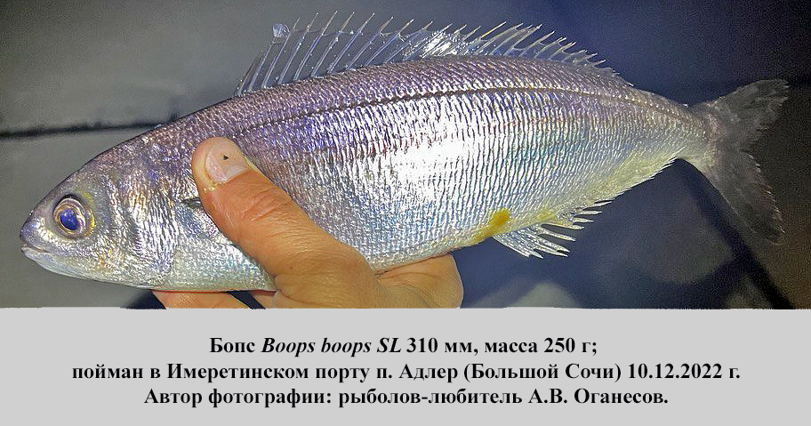 For the first time, an adult bogue Boops boops has been found off the northeastern coast of the Black Sea. A male with a standard length of 310 mm and a weight of 250 g was been caught in Sochi Imeretinsky Port in December 2022. Based on literature data on the presence of the species off the Russian coast of the Black Sea, we suggest the reasons for the presence of previously discovered bogue eggs and larvae in ichthyoplankton samples off the Crimea and the Caucasus coasts.