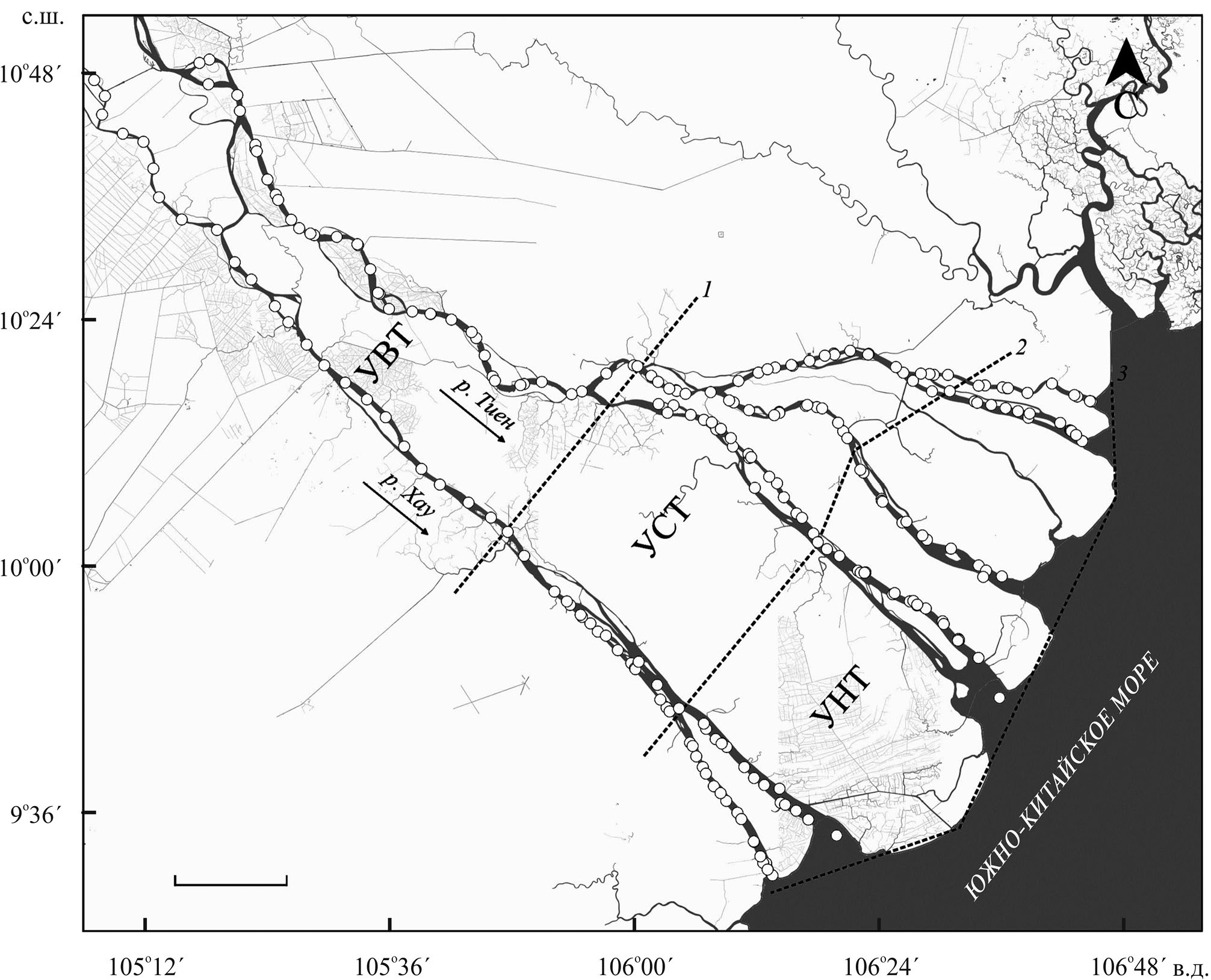 Рис. 1. Схема расположения мест тралений (○) и районирования дельты р. Меконг: 1, 2 – границы соответственно пресноводной и солоноватоводной частей; 3 – морской край дельты; УВТ, УСТ, УНТ – участки соответственно верхнего, среднего и нижнего течения; (→) – направление течения. Масштаб: 20 км.