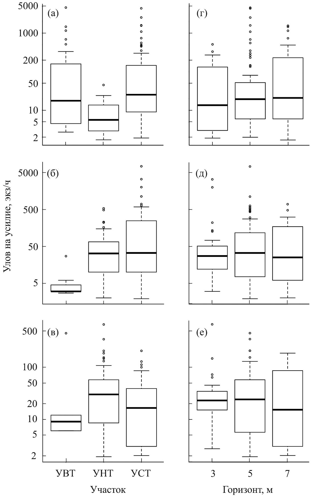 Рис. 2. Пространственное распределение представителей изученных семейств ихтиофауны дельты р. Меконг в сухой сезон: а–в – горизонтальное распределение по участкам дельты, г–е – вертикальное распределение (на различных горизонтах водной толщи); а, г – Pangasiidae; б, д – Polynemidae; в, е – Sciaenidae. На диаграммах размаха отражены медиана, межквартильный интервал, минимальное и максимальное значения, отстоящие не более чем на 1.5 межквартильных интервала соответственно от первого и третьего квартилей; (°) – экстремальные значения. Ост. обозначения см. на рис. 1.