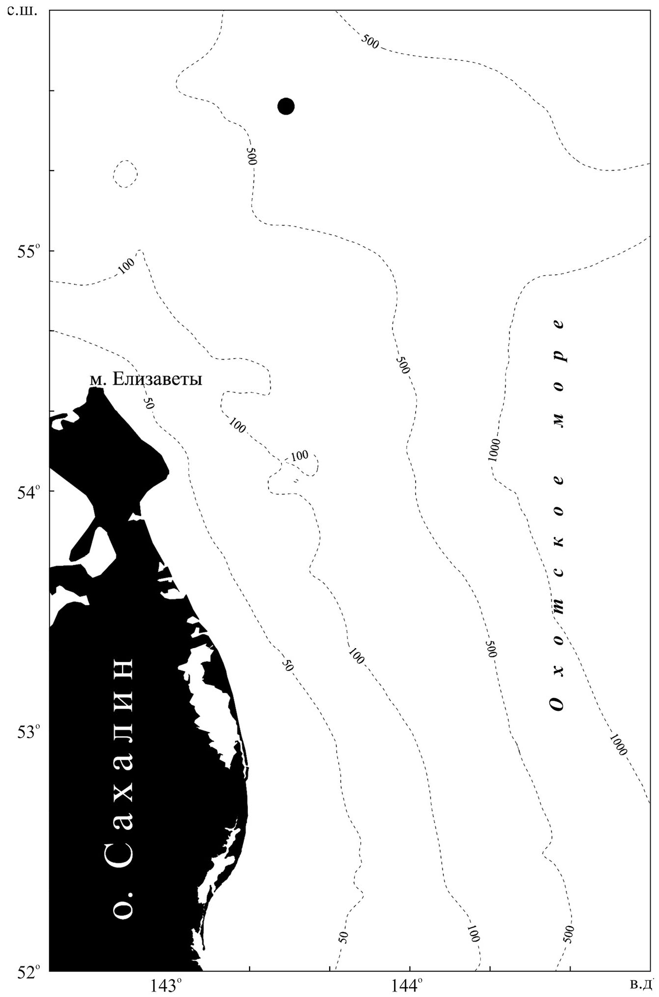 Рис. 1. Место поимки особи-лейкиста чёрного палтуса Reinhardtius hippoglossoides: (●) – порядок донных сетей, (- - -) – изобаты.