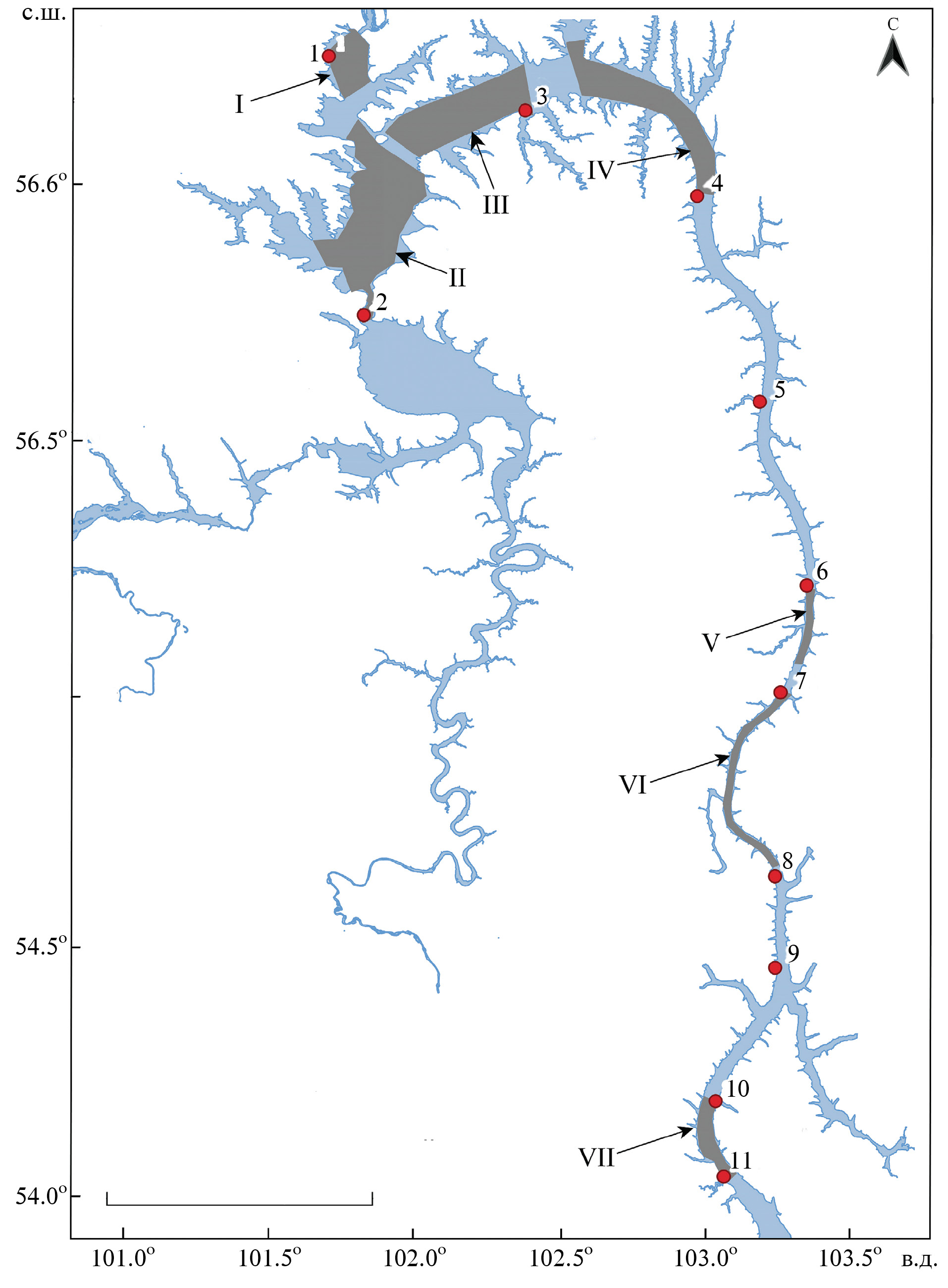 Исследования проводили в Ангарской и Окинской акваториях Братского водохранилища (рис. 1) в июне–июле 2023 г – в период летней стратификации. В нижней озеровидной части водоёма обследовали приплотинный плёс (участок I), Долоновское расширение нижней части Окинской акватории (участок II) и два участка (III, IV) широтного Наратайско-Заярского плёса. Участок IV – переходный между озёрной и речной частью водохранилища. Речные обследованные участки акватории водохранилища были представлены Ангарским меридиональным сужением (участки V, VI) и нижней частью Балаганского плёса (участок VII) (названия приведены в соответствии с указанными в “Правилах …”1).