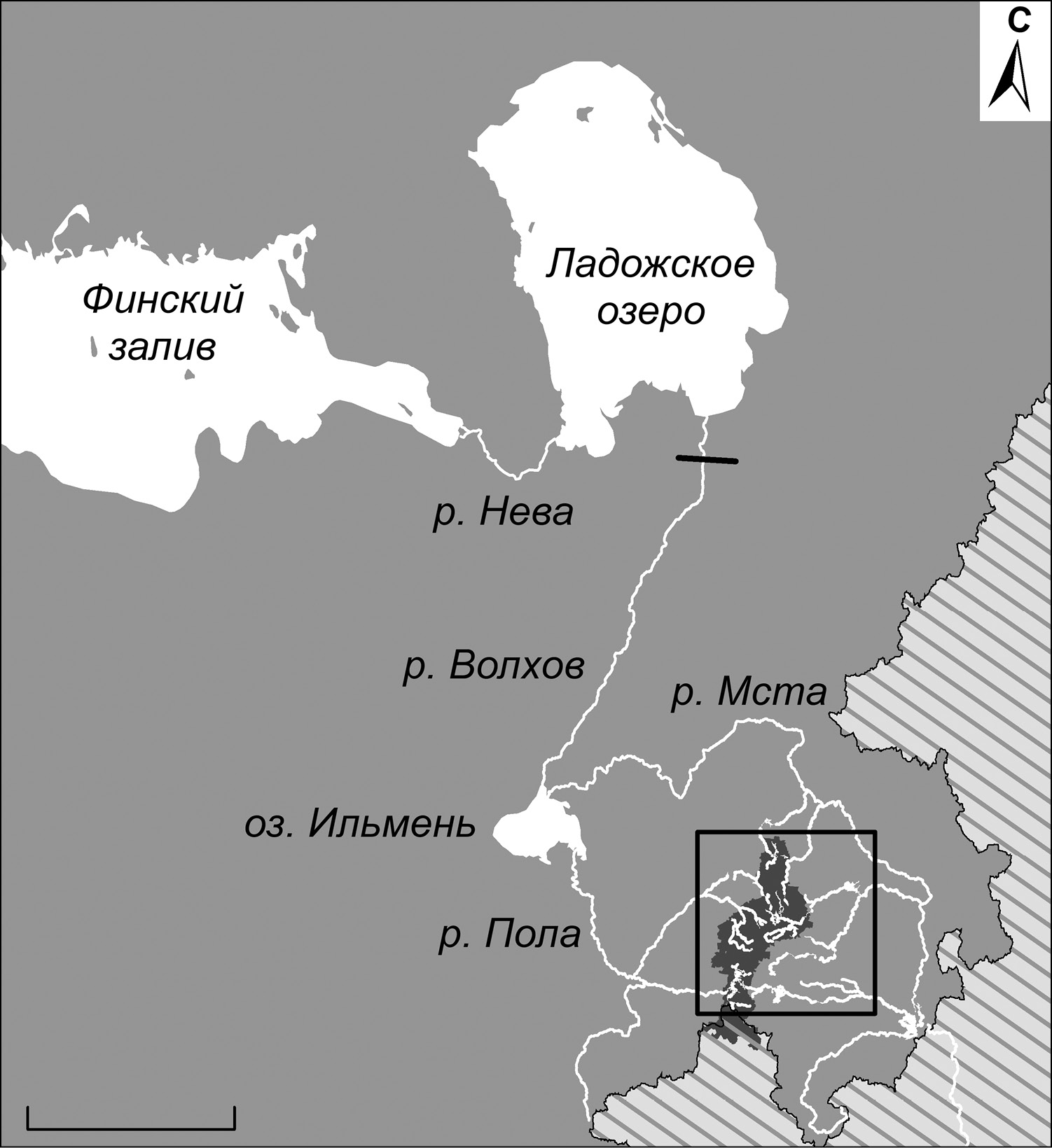 Расположение района работ (□) относительно Балтийского моря и схема соединяющих их водных путей. Водосборные бассейны морей: (■) – Балтийского, (▧) – Каспийского. (■) – территория Национального парка “Валдайский”, (▬) – плотина Волховской ГЭС. Масштаб: 100 км.