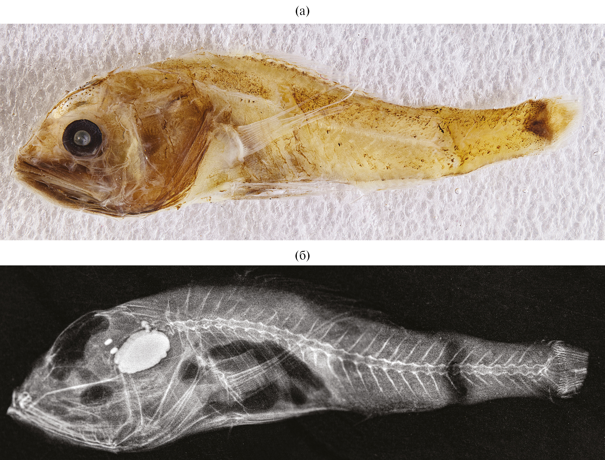 Рис. 2. Melamphaes leprus SL 17.5 мм: а – внешний вид, б — рентгенограмма.