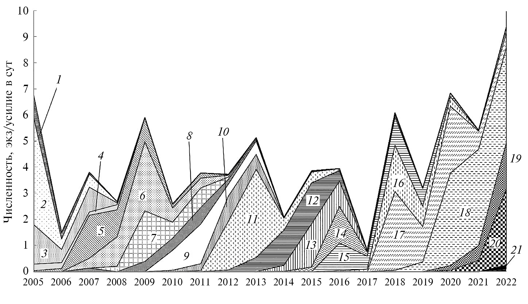 Таким образом, при дальнейшем анализе весь ряд данных может быть разделён на четыре этапа: 1) относительно высокой численности (до 2005 г.); 2) снижения численности (2005–2006 гг.); 3) периодических колебаний численности на низком уровне — состояние динамического равновесия (2007–2018 гг.) и 4) увеличения численности — переход в новое состояние (2019–2022 гг.).
