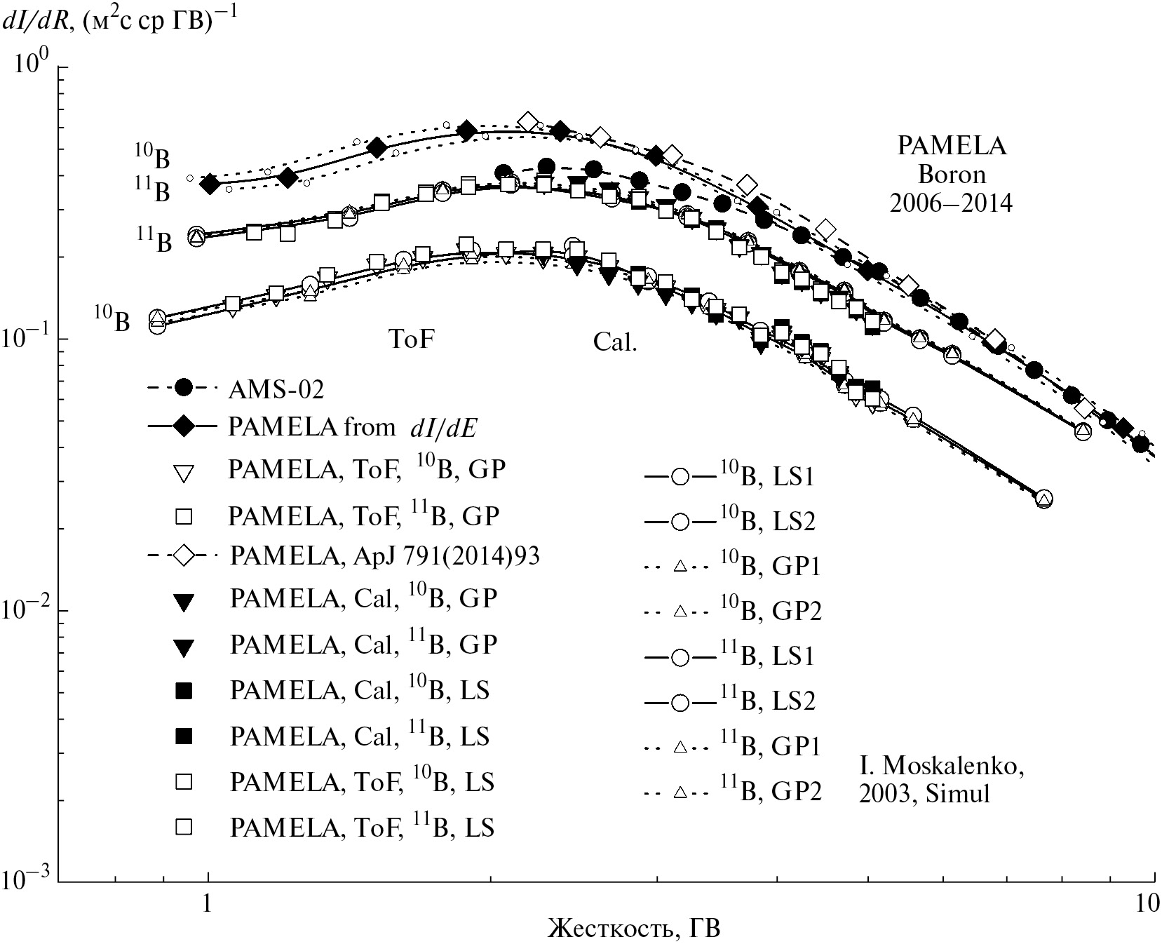 Обнаруженные при анализе данных эксперимента PAMELA для изотопов B при жесткостях ~1–5 ГВ отклонения изотопного состава от ожидаемого для ГКЛ являются вероятным указанием на вклад локальных источников с эффектом на уровне десятков процентов. Данные для соотношений 11B/10B получены в хорошем согласии двумя независимыми методами (анализ данных TOF и калориметра), хорошо согласуются с немногочисленными результатами существующих измерений [3, 7], что повышает их достоверность. Наш анализ данных AMS-02 при жесткостях ~30–1000 ГВ для позитронов, антипротонов и ядер от H до Fe [9] указывает на коррелированные подъемы интенсивности с эффектом на уровне единиц процентов от ГКЛ, которые могут быть связаны с обычными вторичными ядерными взаимодействиями и процессами ускорения в остатках близких SNRs, и складывается впечатление, что данные AMS-02 для антипротонов и позитронов не связаны с проблемой природы темной материи.