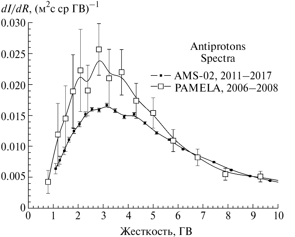 Рис. 5. AMS-02 и PAMELA, спектры антипротонов при жесткости 1–10 ГВ.