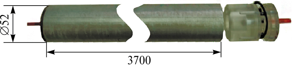 Для создания годоскопа используются предварительно модернизированные ДТ (рис. 2), демонтированные с мюонного спектрометра комплекса ‟Меченых нейтрино” [5], работавшего в НИЦ ‟Курчатовский институт” — ИФВЭ около 35 лет назад. Корпус ДТ представляет собой алюминиевый цилиндр внешним диаметром 52 мм с толщиной стенки 0.8 мм, внутренняя поверхность которого служит катодом. Анодом служит вольфрамовая позолоченная проволока толщиной 50 мкм, натянутая с натяжением ~250 г между двумя торцевыми заглушками и закрепленная пайкой в их центральных латунных штифтах с точностью ~1 мм относительно центров торцевых заглушек. Торцевая заглушка состоит из двух частей — корпуса и крышки, материал — оргстекло. Герметичность ДТ обеспечивается резиновым уплотнительным кольцом диаметром 2 мм, зажатым между этими двумя частями торцевой заглушки с помощью винтов. Подача рабочего газа осуществляется через латунную трубку внутренним диаметром 3 мм, впрессованную и уплотненную герметиком к корпусу торцевой заглушки.