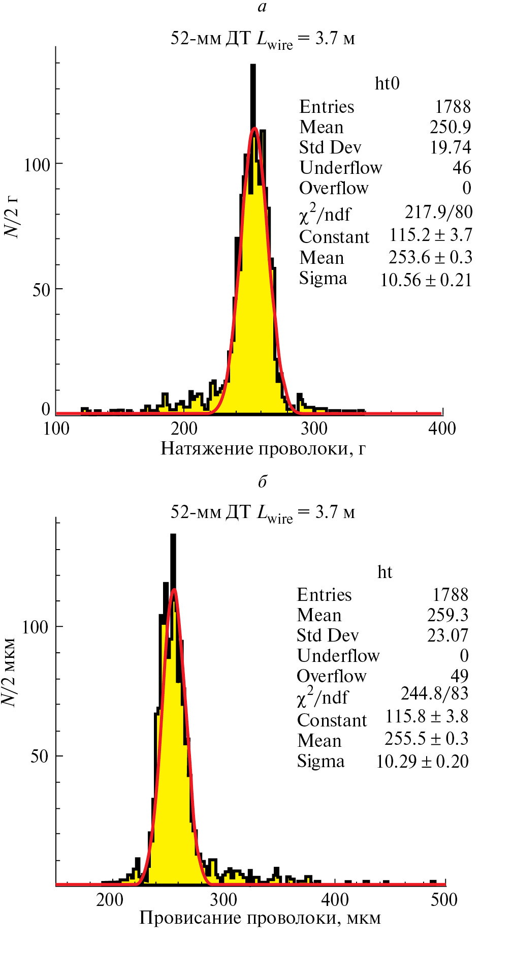 В некоторых ДТ, также из-за старости, наблюдалось ослабление натяжения проволоки и даже их обрыв. Фактическое натяжение проволоки мы измерили по известной методике — путем измерения частоты их резонансных колебаний [6]. Распределения натяжения и расчетного провисания проволоки для 1788 ДТ приведены на рис. 3. Оборванные и ослабленные (до менее 90 г) проволоки были заменены на новые.