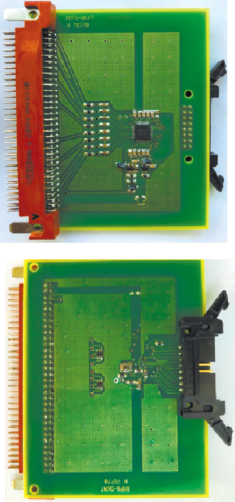 Сигналы, считываемые с ДТ, усиливаются 8-канальным усилителем (рис. 5) на основе интегральной схемы ОКА-2, разработанной по сверхвысокочастотной малошумящей технологии Bi-jFET, которая позволяет изготавливать n—p—n-транзисторы с пороговой частотой >3 ГГц и коэффициентом усиления по току >150. Микросхемы выпускаются в пластиковом корпусе QFP48.