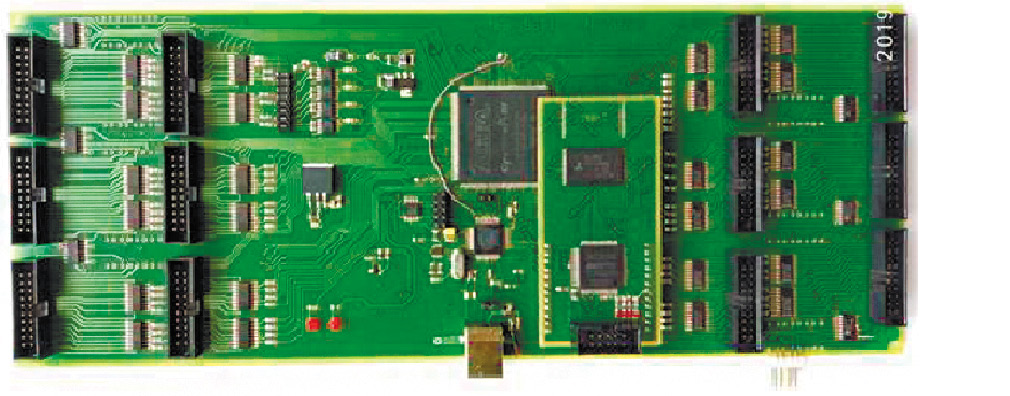 Платы NAK-96 [7] (рис. 6) предназначены для использования в качестве устройств времяцифрового преобразования, а также интерфейса к компьютеру. На 12 разъемов платы NAK-96 подается до 96 сигналов от усилителей ДТ в уровнях LVDS (на каждый разъем поступают сигналы от восьми усилителей). При необходимости сигналы с некоторых каналов могут быть замаскированы. Обработка принятых сигналов осуществляется в аппаратном процессоре, реализованном в ПЛИС ALTERA типа EP3C16Q240C8 (производитель ALTERA, Cyclone III). Накопление промежуточных данных реализуется во внутренней памяти объемом 16 кБ. Управление процессами преобразования и считывания, а также конфигурирование системы из нескольких плат осуществляется через USB-канал.