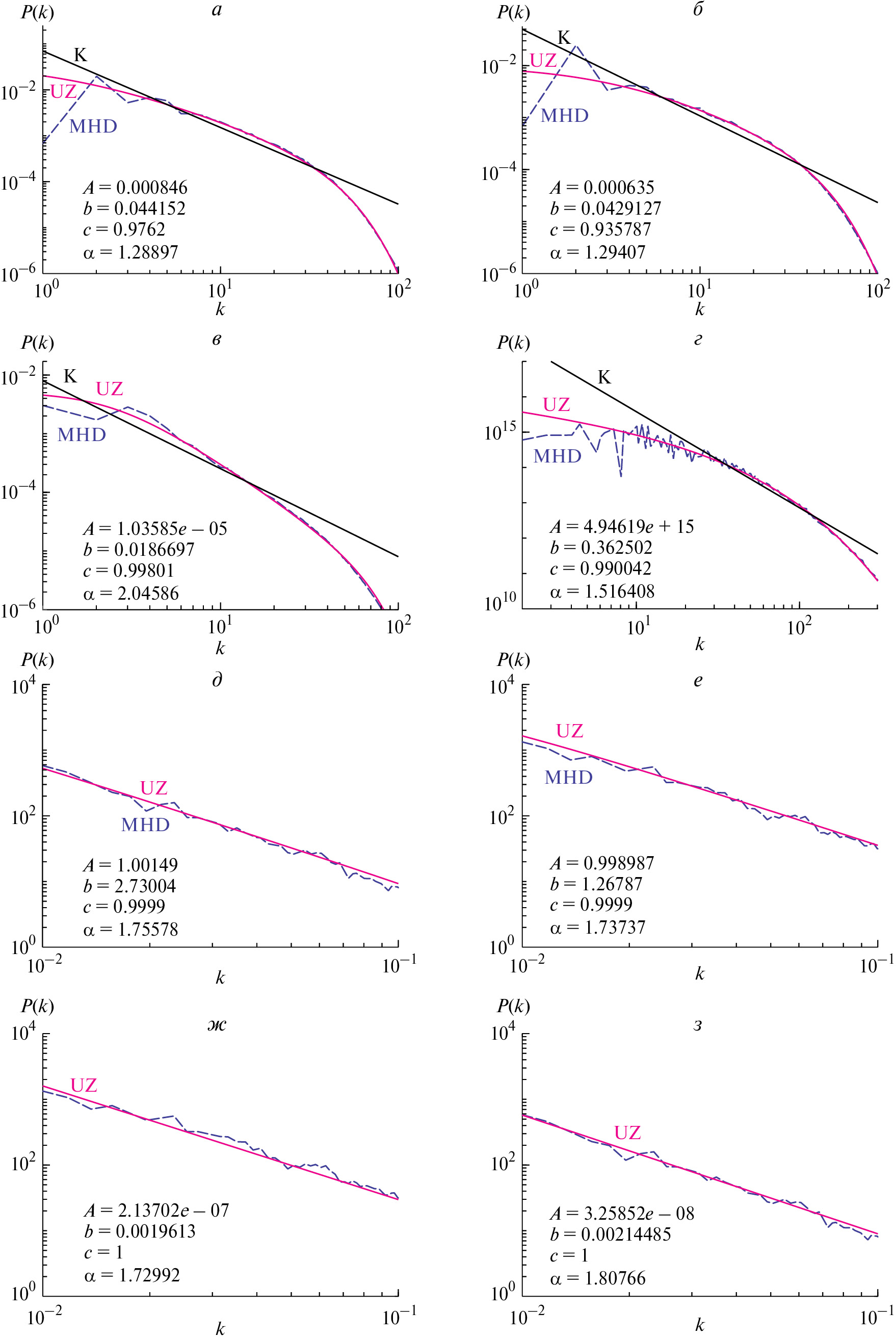 Что касается итога работы в целом, можно отметить следующее. Поскольку выражение (4) выведено не из динамических соображений, а скорее из феноменологических с использованием гидродинамических аналогий (ОЦ-уравнение), важно было убедиться в том, что 4-параметрическая форма (4) является достаточно гибкой, чтобы хорошо воспроизводить типичные особенности таких спектров. В качестве реперных спектров, как и в предыдущей нашей работе, были выбраны результаты численных расчетов по МГД-кодам [28, 29]. Сравнение показало, что УЗ-аппроксимация хорошо представляет результаты численных МГД-расчетов и может быть успешно использована в рамках классической теории, турбулентной для (2) и (3), вместо приближенных формул S(k).