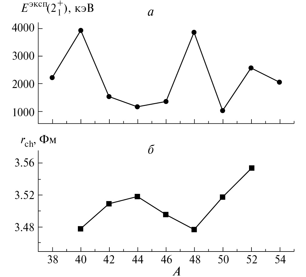 Рис. 1. Экспериментальные энергии (а) и среднеквадратичные зарядовые радиусы rch (б) четных изотопов Са.