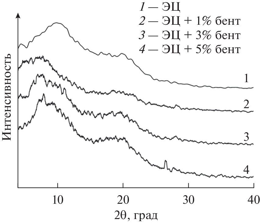 Mechanical dispersion was used to modify ethyl cellulose with the particles of bentonite clay. The prepared ethyl cellulose/bentonite composite film materials were characterized by optical microscopy and X‑ray diffraction. The thermal behaviors of both the films and the initial polymer powder were studied by using differential scanning calorimetry. It was found that the introduction of bentonite reduced the characteristic temperatures of glass transition and melting of the polymer material.