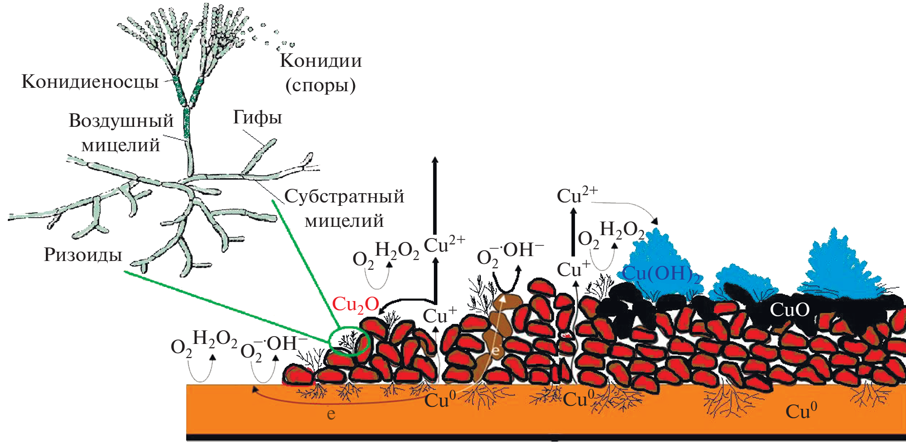 Corrosion resistance of structural materials has become one of the most important aspects in the electronics industry. In particular, biodeterioration and biocorrosion lead to operational failures and high economic losses. Biocorrosion of copper and base materials applied for the production of printed circuit boards is studied in this work. The inevitable change in the properties and destruction of textolite and glass textolite that are used in the composition of radioelectronic components and are in contact with copper often results in violations of the performance of devices and equipment. An attempt to explain the role of biofilms of microfungi as the main factor of mycological corrosion of copper in the composition of some electronic-industry products is made in this work.