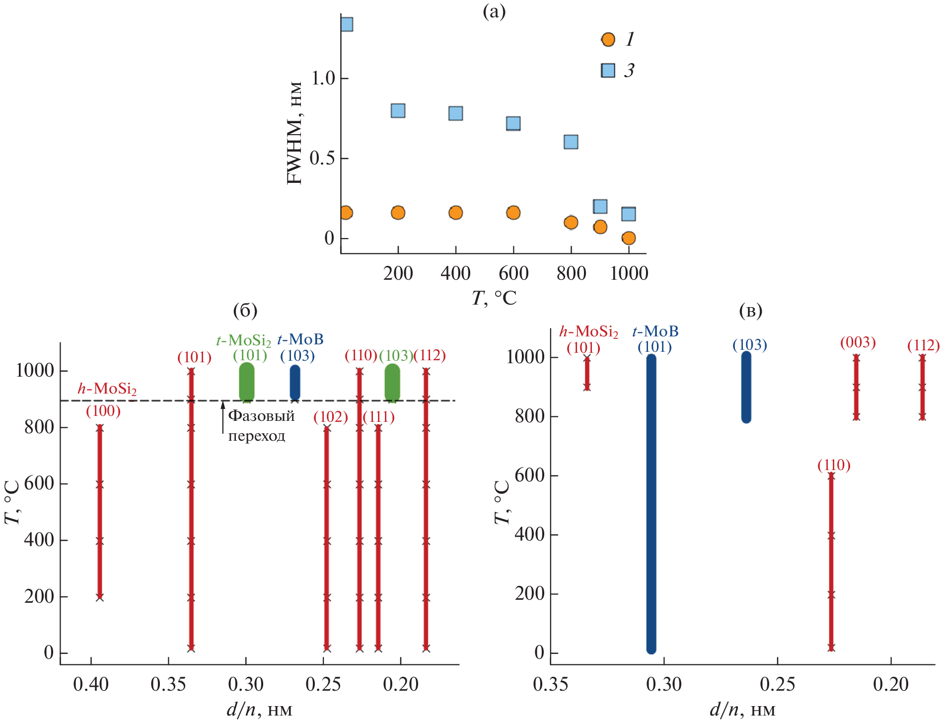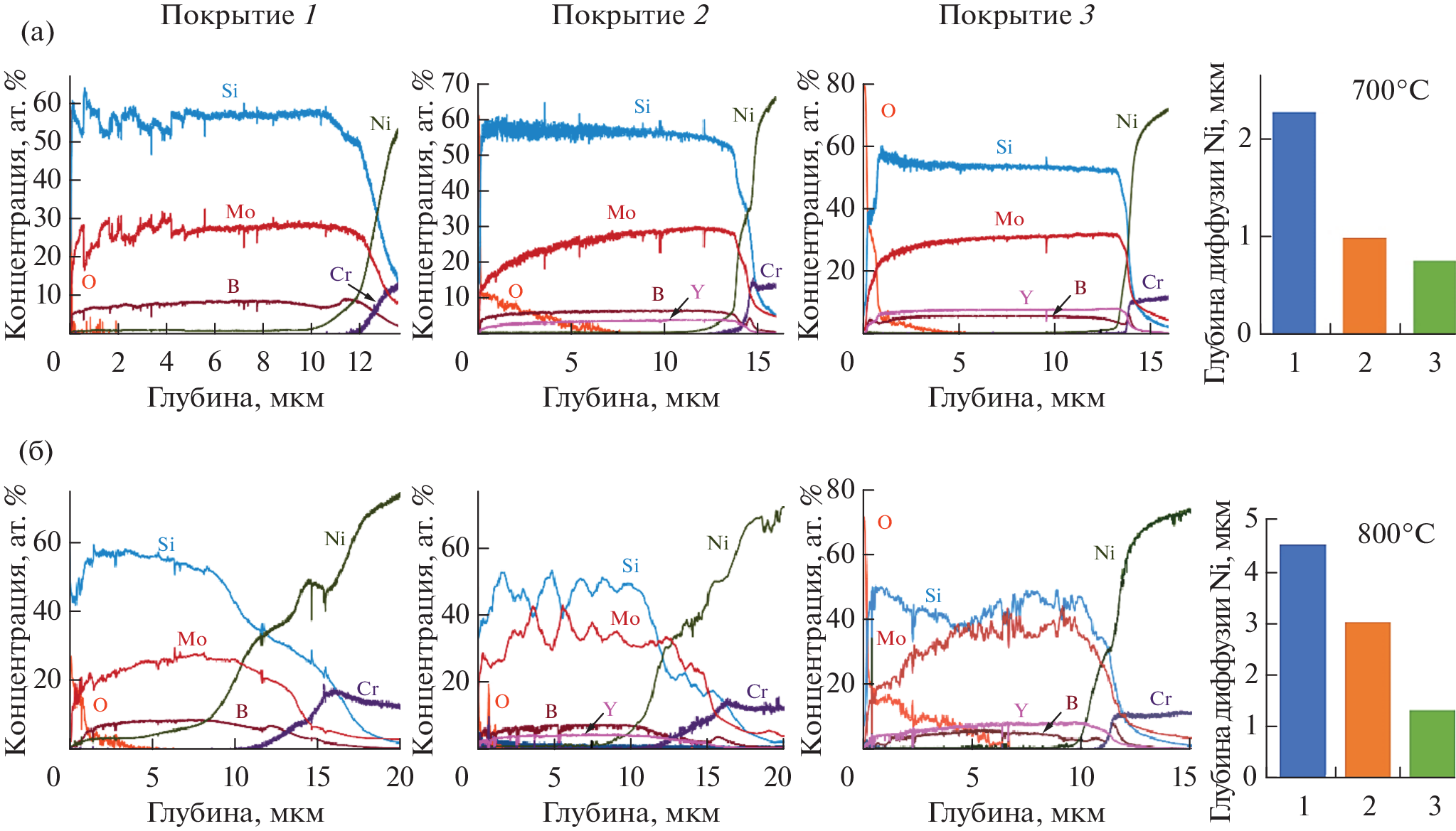 The Mo–Si–B and Mo–Y–Si–B coatings were obtained by magnetron sputtering in the direct-current mode using a 90% MoSi2 + 10% MoB target equipped with yttrium segments. The composition and structure of the coatings were studied by scanning electron microscopy, X-ray phase analysis, and optical emission spectroscopy of a glow discharge. The diffusion-barrier properties and heat resistance were evaluated by annealing at temperatures from 700 to 1000°C. The thermal stability was determined by heating the coating lamellae in a column of a transmission electron microscope in the in situ mode. According to the chemical analysis, the main elements were evenly distributed over the thickness of the coatings. The coating growth rate did not change upon the introduction of yttrium and was in the range of 325–350 nm/min. The Mo–Si–B coating was characterized by a columnar structure with grains of the hexagonal phase h-MoSi2 about 50 nm in size, as well as an insignificant volume fraction of the boron-containing amorphous phase (a‑MoB). An increase in the concentration of Y up to 4 at % led to a decrease in the size of h-MoSi2 crystallites of up to 10 nm. A coating with a maximum concentration of yttrium (7 at %) contained predominantly an amorphous phase a-MoB with phase crystallites dispersed in it h-MoSi2 and t-MoB. The introduction of the optimal amount of yttrium (4 at %) led to a decrease in the thickness of the oxide film by a factor of 6 after annealing at a temperature of 800°C and by three times at 900–1000°C. The coating with the maximum concentration of yttrium (7 at %) had the best diffusion-barrier properties of all the studied samples at 700–1000°С, and also surpassed the Mo–Si–B sample in terms of thermal stability. Positive effects from the introduction of yttrium into the composition of the coatings were connected with (a) structure modification, including suppression of columnar grain growth; (b) transition to a structure with a higher volume fraction of the amorphous phase; (c) isolation of grain boundaries and lengthening of the diffusion path of metal atoms from the substrate; and d) formation of protective surface layers on based on yttrium oxide when heated in air.