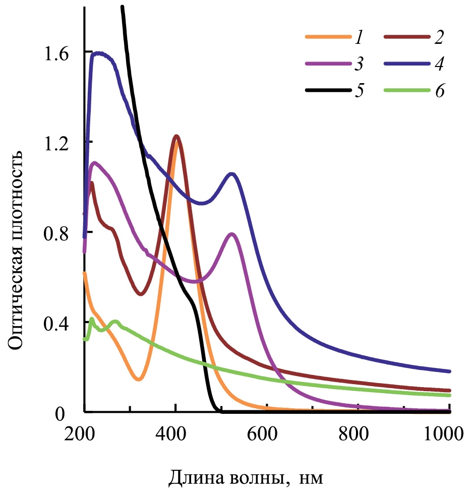 Рис. 1. Спектры поглощения w-декановых органозолей наночастиц: 1 - Ag, 2- SiO₂@Ag, 3 - Au, 4- SiO,@Au. 5 - CdS в 0.25 М AOT, 6 - SiO₂ (10 мг/мл).