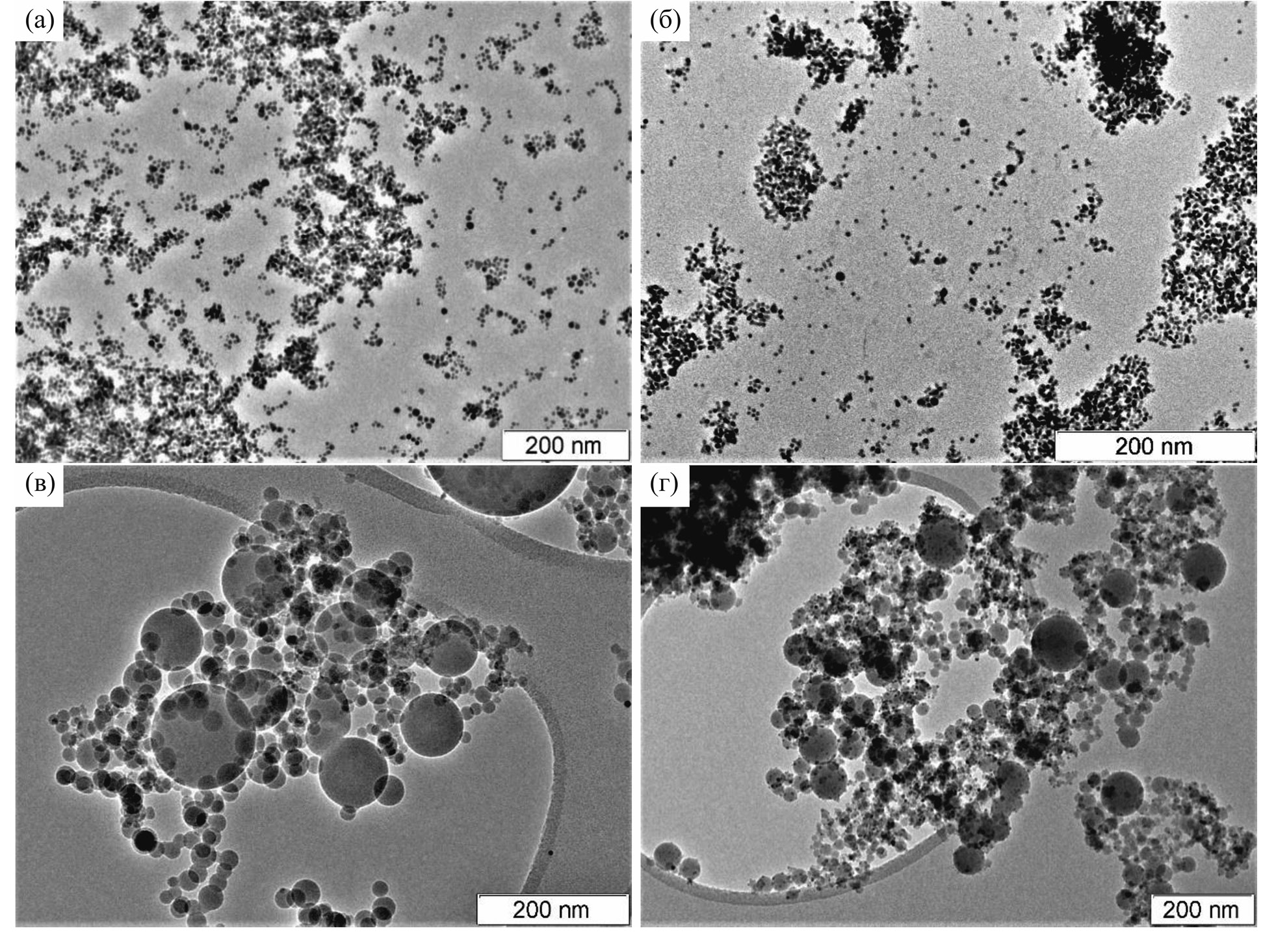 Рис. 2. ПЭМ изображения наночастиц серебра (а), золота (б), диоксида кремния (в) и диоксида кремния с адсорбированными наночастицами серебра (г).
