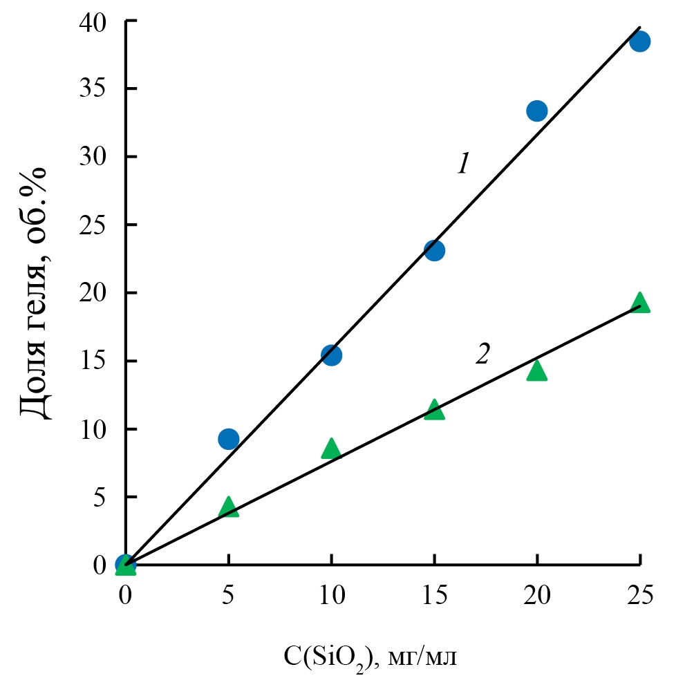 На рис. 3 представлены зависимости объема выделившегося органогеля SiO₂. Было показано, что гели SiO₂ образуются в интервале концентраций от 5 до 25 мг/мл. Чем выше концентрация частиц SiO₂ в органозоле, тем больший объем геля получался. Так, в исследуемом диапазоне концентраций объемная доля геля увеличивалась от 9 до 39 об. % для н-декановых органозолей. Кроме того, гели диоксида кремния формируются и в растворах AOT в н-декане. Однако при добавлении 0.25 М AOT в органозоли во всем диапазоне исследуемых концентраций SiO₂ объемная доля геля уменьшалась примерно в два раза.