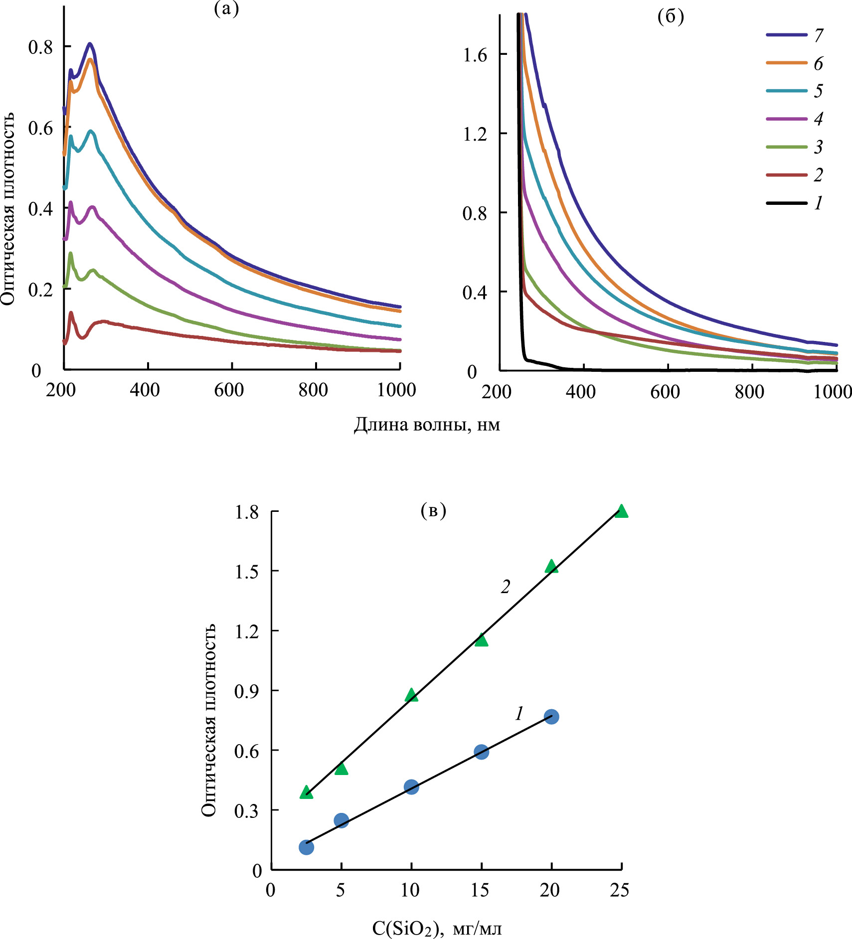 Рис. 4. Спектры поглощения н-декановых органозолей состава: (а) SiO₂ и (б) SiO₂ + 0.25 М AOT. Концентрация SiO₂ в органозолях: 1 – 0, 2 – 2.5, 3 – 5, 4 – 10, 5 – 15, 6 – 20, 7 – 25 мг/мл. Оптическая плотность (в) на длине волны 262 нм в зависимости от концентрации SiO₂: 1 – SiO₂, 2 – SiO₂ + 0.25 М AOT.