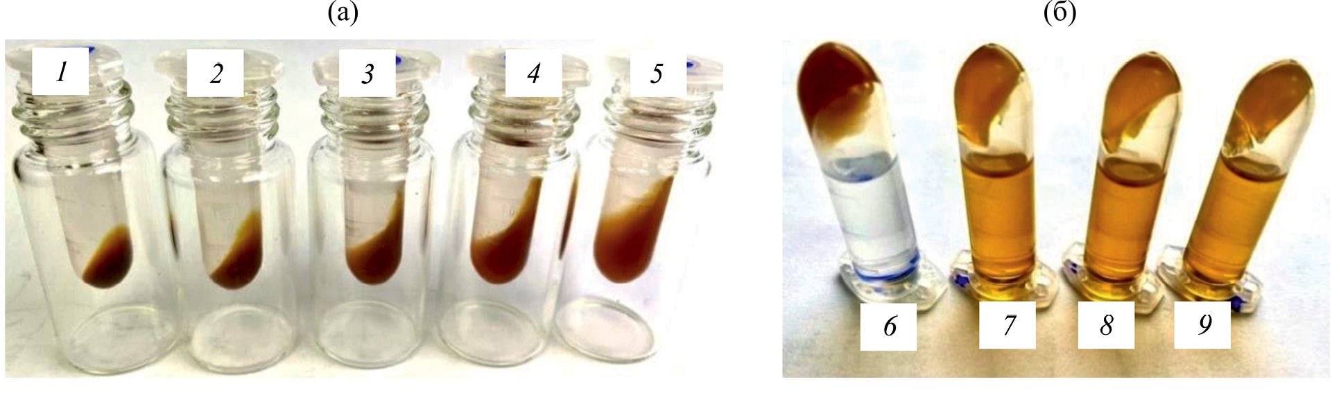 Рис. 5. Фото гелей SiO,@Ag в зависимости от концентрации SiO, (а) и AOT (б) в исходных w-декановых органозолях. Состав органозолей: 1 - 5, 2 - 10, 3 - 15, 4 - 20, 5 - 25 мг/мл SiO₂; 6- 0, 7- 0.05, 8 - 0.15, 9 - 0.25 M AOT.