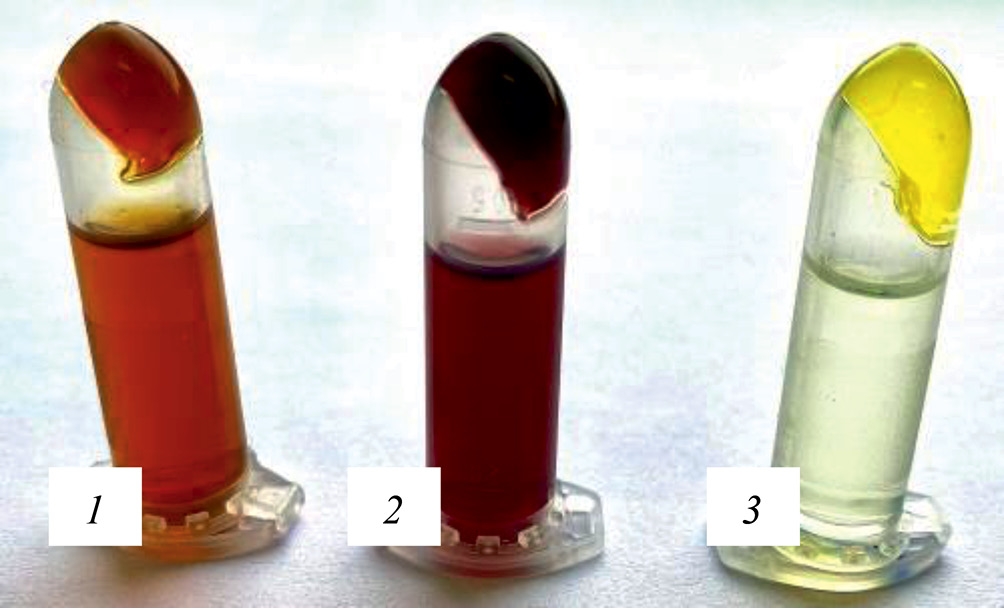 Рис. 6. Фото цветных гелей SiO₂@NPs: 1 - SiO₂@Ag, 2 - SiO₂@Au, 3 - SiO₂@CdS. Концентрации SiO₂ и AOT в исходных органозолях: 10 мг/мл SiO₂ и 0.25 М AOT.