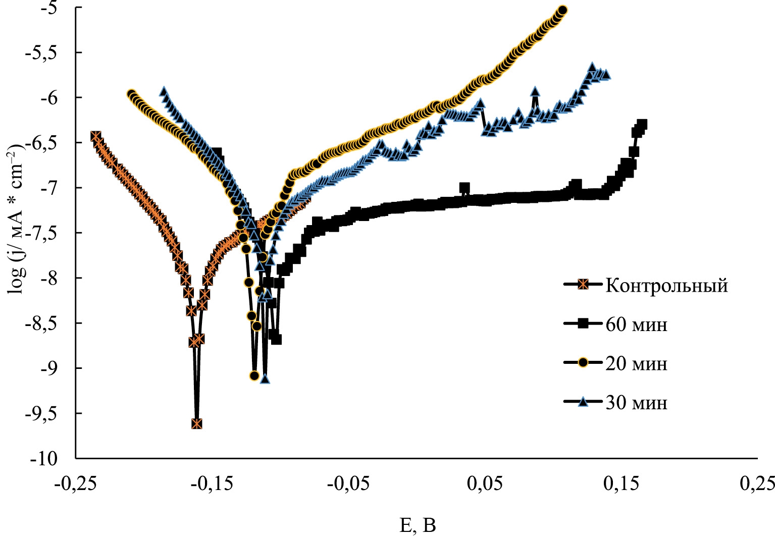 На следующем этапе был изменен режим обработки поверхности (Ar (10 мин) + N₂ (20, 30, 60 мин)). Результаты исследования кинетических закономерностей (тафелевские участки) выявили на анодной оси устойчивую и продолжительную область пассивности для режима (Ar (10 мин) + N₂ (60 мин)) (рис. 2). После обработки поверхности происходило смещение стационарного потенциала на 0,09–0,11 В.