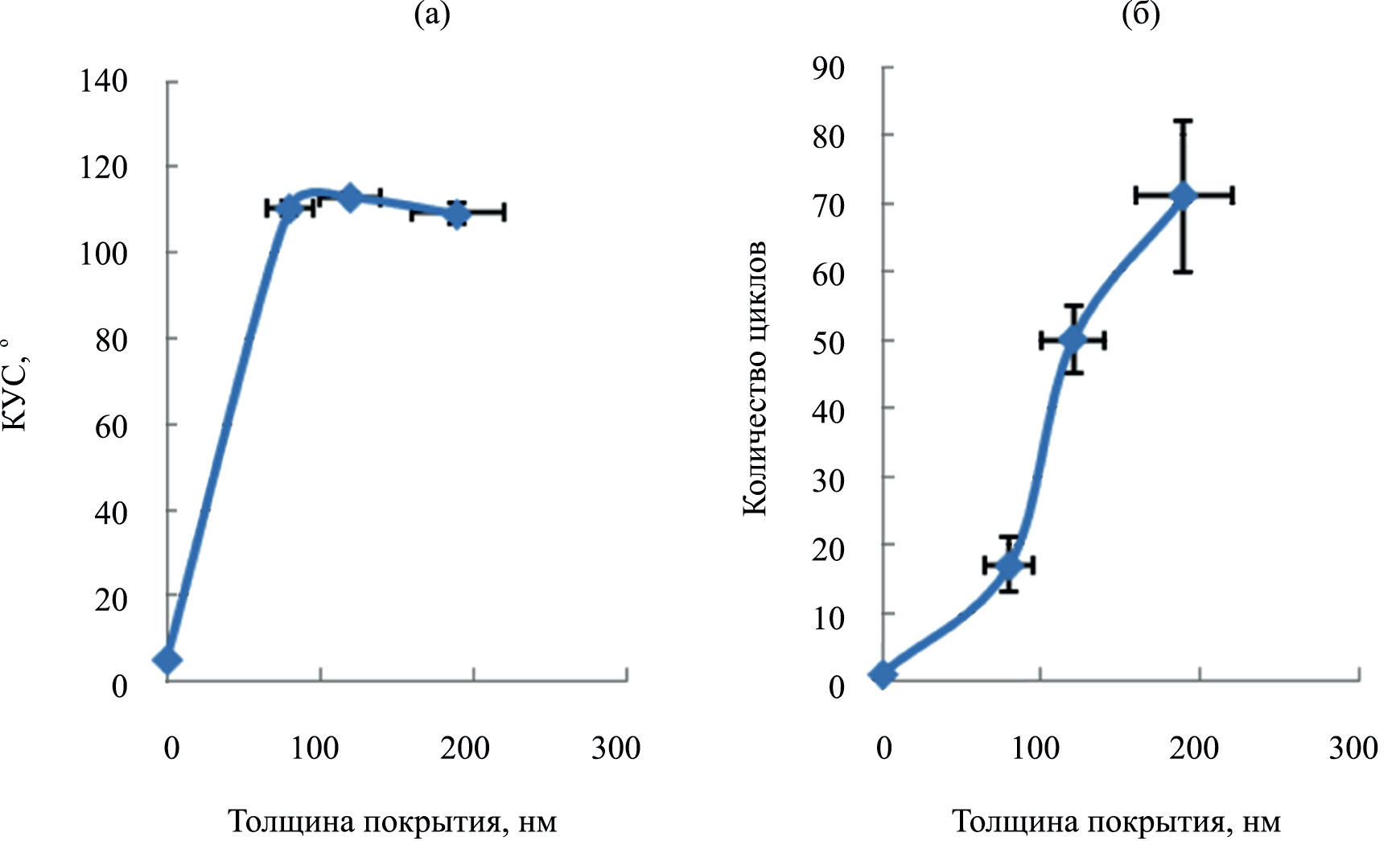 Формирование покрытий на основе о-ГЕМС (табл. 1) или о-ГЕФС на стальных и стеклянных подложках (рис. 3) также позволяет придавать им гидрофобные свойства. Наибольшими значениями КУС, 112.5 ± 1.0° и 113.4 ± 1.6°, характеризуются покрытия из о-ГЕФС толщиной 120.0 ± 10.0 нм и 110.0 ± 10.0 нм, полученные на стали и стекле соответственно. Удаление материала данных покрытий из зоны контакта поверхностей и их повреждение в парах трения сталь 95Х18 (сфера) – сталь 12Х17, стекло (плоскость) наблюдается после 71 ± 15 циклов скольжения для o-ГЕФС на стали и 68 ± 8 циклов на стекле (рис. 3), а kf стеклянной и стальной поверхностей уменьшается с 0.2 до 0.08. Значения КУС покрытий из o-ГЕФС на стали толщиной 234.0 ± 10.0 нм и стекле 213.0 ± 10.0 нм составляют 109.6 ± 1.2° и 108.7 ± 1.8° соответственно, что также обусловлено ухудшением их однородности при увеличении толщины.