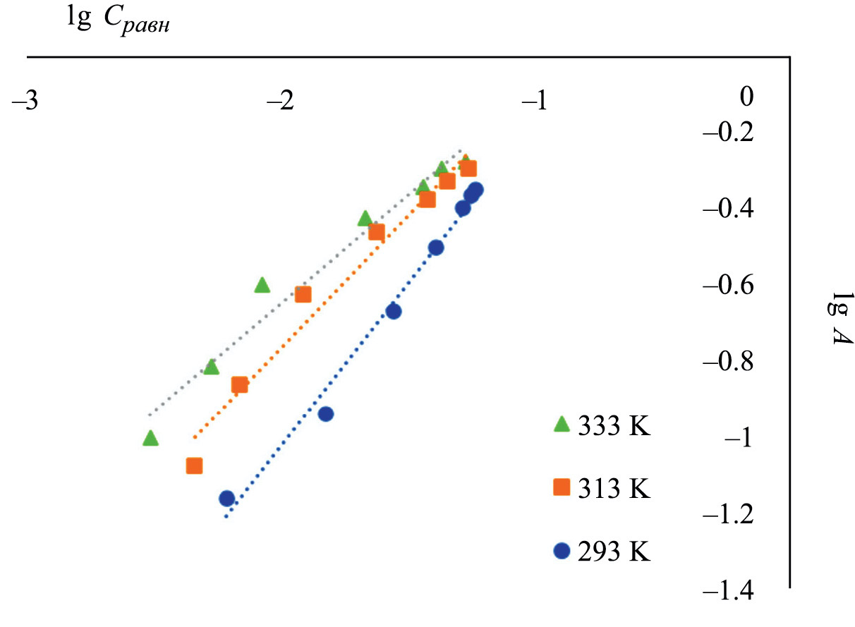 где А – величина адсорбции, ммоль/г; Сравн. – равновесная концентрация ионов металла, ммоль/дм3; Kф и n – постоянные.