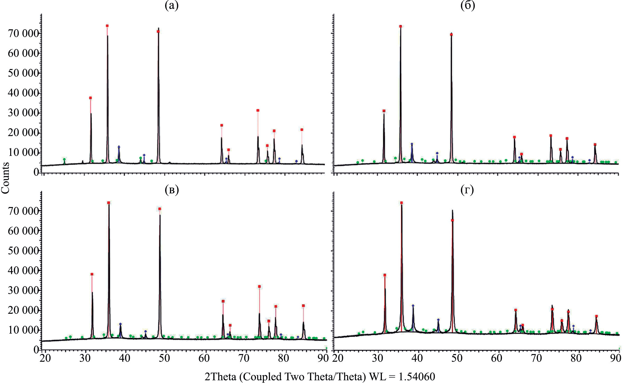 Рис. 1. Рентгенограммы образцов соответственно Uп = 200 В (а), 150 В (б), 100 В (в) и 50 В (г), зеленый – γ-; красный – карбид вольфрама WC, синий – Al.