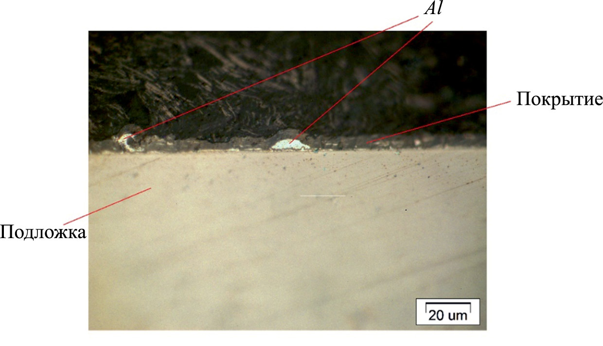 В определенных местах присутствуют светлые участки, которые отражают присутствие в покрытиях капель чистого алюминия (рис. 4), появление которой является недостатком данного метода получения покрытия, поскольку может негативно отражаться на эксплуатационных характеристиках покрытия.