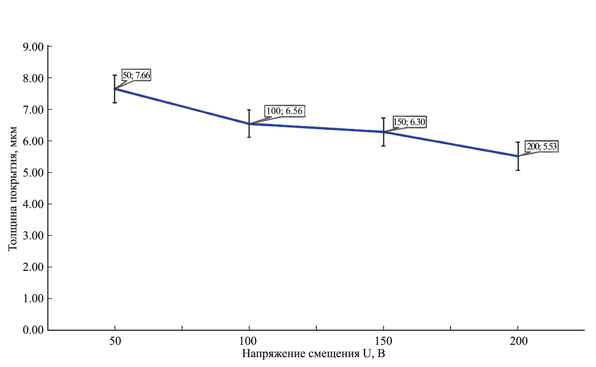 Таким образом, проведенный эксперимент указывает на связь между значением напряжения смещения и получаемым фазовым составом. При уменьшении напряжения смещения получаются образцы с покрытиями с уменьшенной долей γ-. Предположительно, отсутствие образования фазы α- связан с недостаточностью поверхностной энергии. Подтверждена зависимость между уменьшением толщины покрытия с увеличением напряжения смещения.
