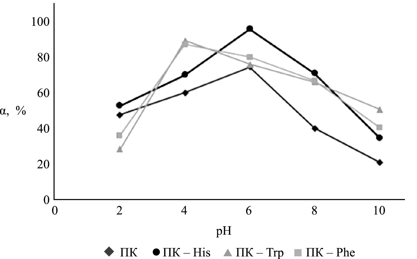 Рис. 4. Зависимость степени извлечения ионов Mn2+ модифицированными пектинами от рН водного раствора.