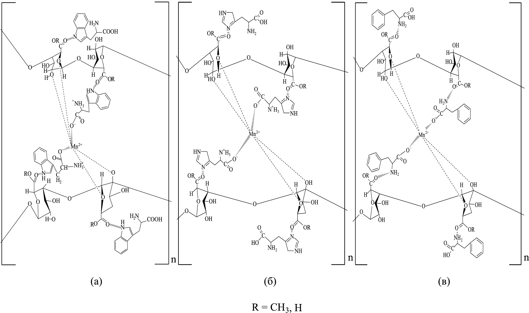 В связи с этим, целью настоящей работы является изучение сорбционных свойств яблочного пектина, модифицированного ароматическими аминокислотами (L-триптофан, L-гистидин, L-фенилаланин) по отношению к ионам Mn2+ и установление взаимосвязи структуры биосорбентов с его сорбционной активностью.