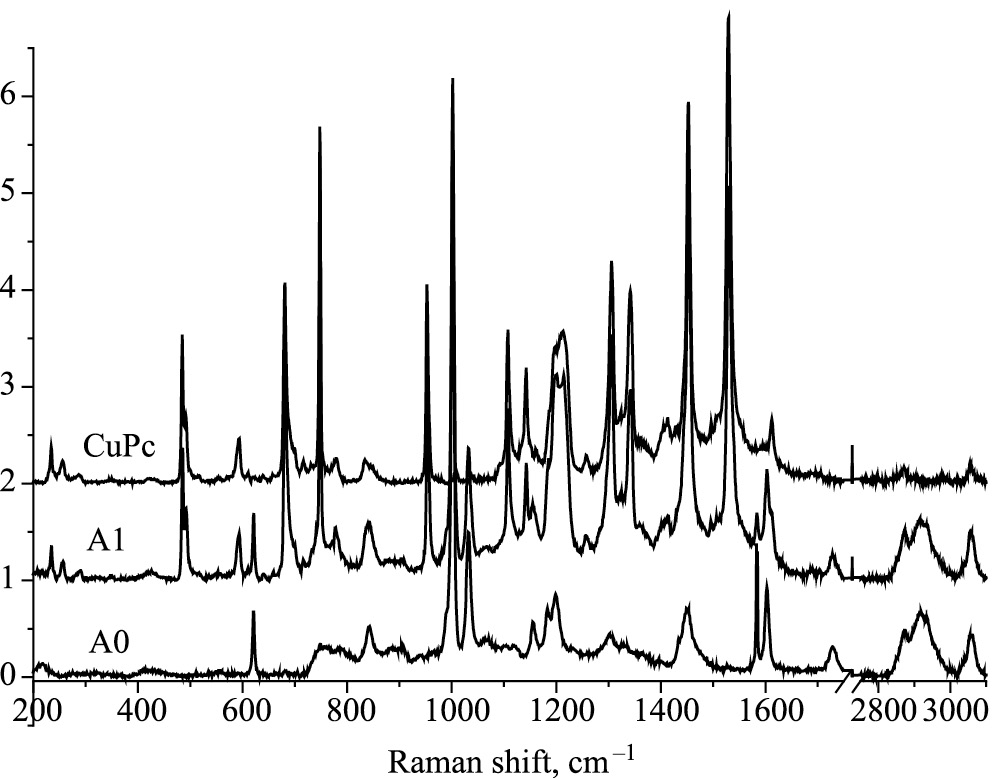 Рис. 3. Раман спектры немодифицированного полимера (А0), фталоцианината и композиции фталоцианинат-полимер (А1).