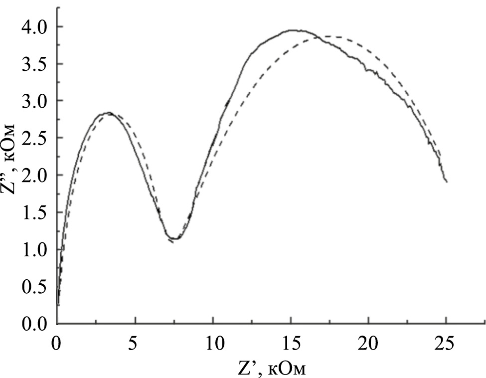 Аппроксимация экспериментального импеданса пластины с покрытием 14 представлена на рис. 9, а расчет элементов эквивалентной схемы – в табл. 6.