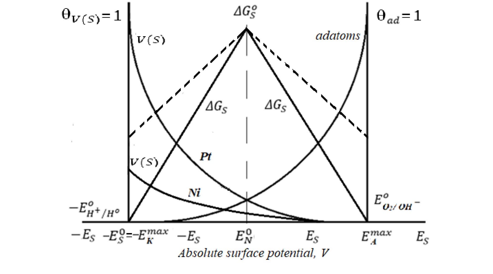Обобщая физико-химическое содержание ЭК процесса, Фрумкин [5] указывал на все возможные взаимодействия реагирующих частиц решетки металла, далее влияние адсорбции и ориентировки молекул растворителя и некулоновской адсорбции ионов фона, и далее замечает, что в литературе рассмотрен ряд корреляций между электролитической активностью металлов и такими величинами как электроотрицательность по Паулингу или работа выхода электрона (см. также п.4), но полной теории электрокатализа не существует.
