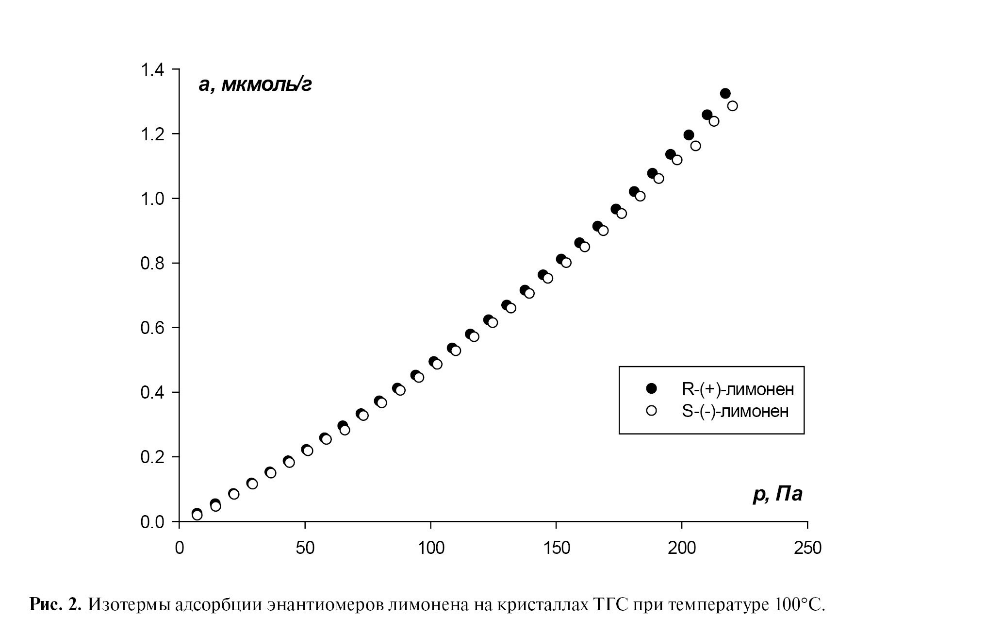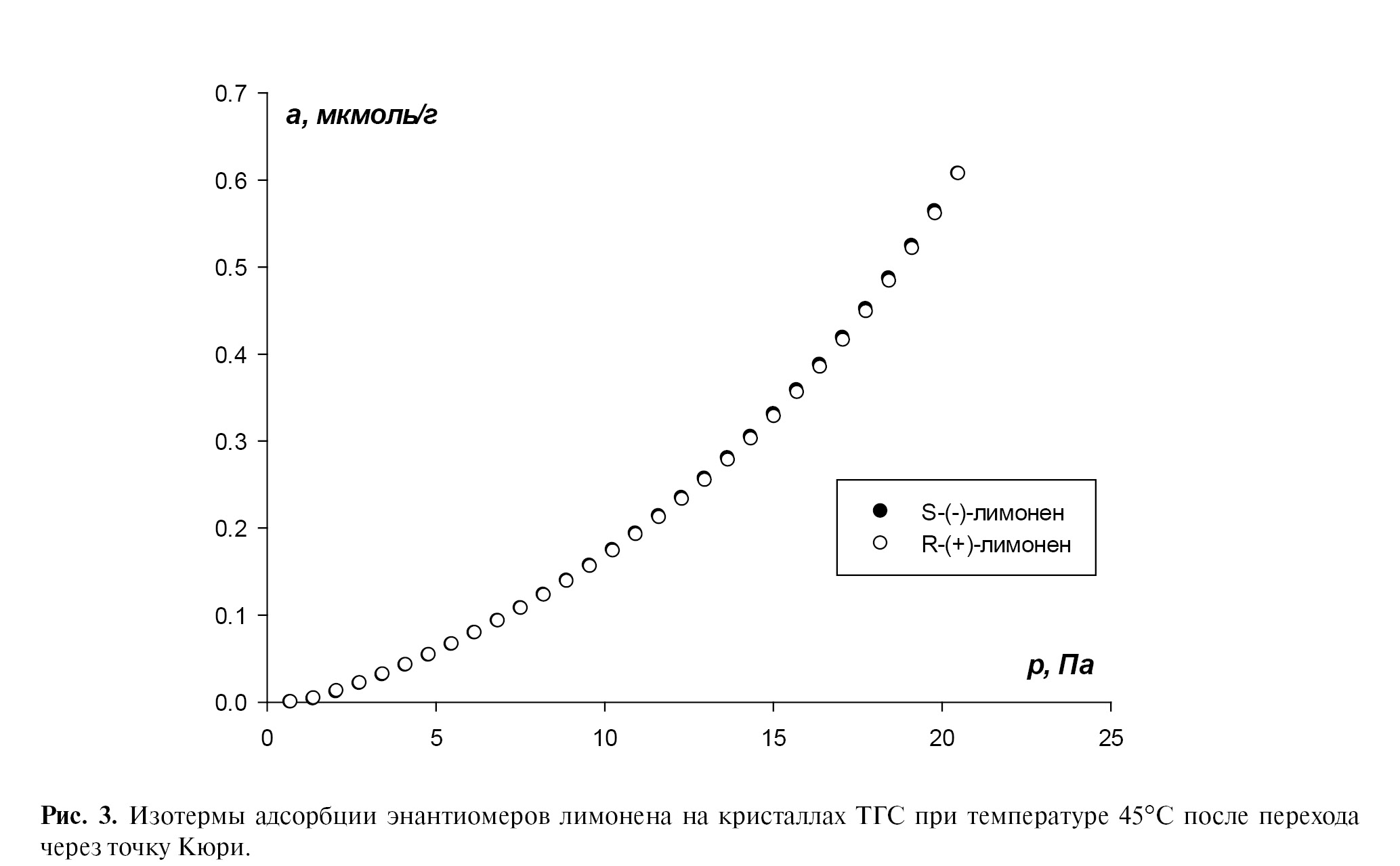 Далее колонка была прогрета при температуре 100°С в течение 8 часов. Температура была выбрана заметно выше точки Кюри (49°С), чтобы гарантировать переход кристаллов в парафазу. Затем при этой же температуре была получена изотерма адсорбции лимоненов (рис. 2). Как видно из изотермы, различий в адсорбции энантиомеров не наблюдается. Обработка экспериментальных значений равновесной адсорбции показывает отсутствие различий при всех давлениях адсорбата (табл. 2). Константы Фрейндлиха равны и составляют 1.8 ± 0.3. Таким образом, при переходе в парафазу хиральность поверхности кристаллов исчезает. Это закономерно и предсказуемо, так как имеются литературные данные о ахиральной пространственной группе симметрии ТГС выше точки Кюри [21].